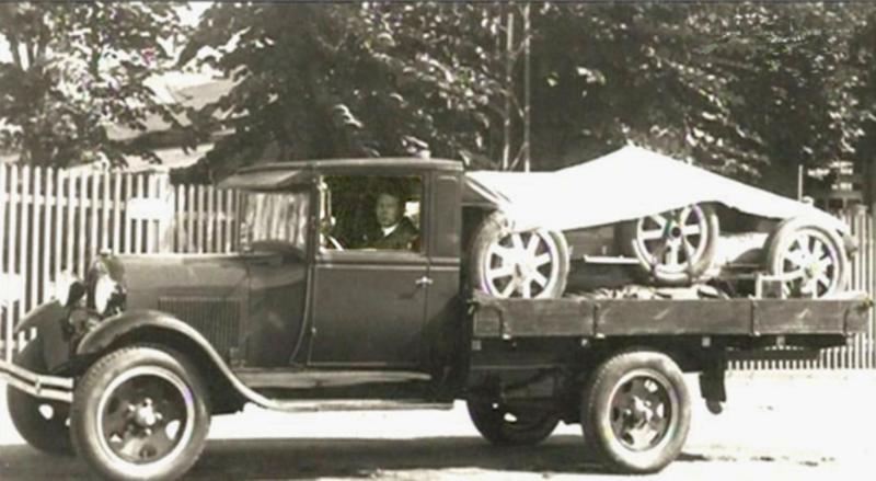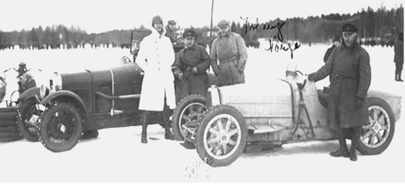 Dette bildet kommer fra et fotoalbum som har tillhört tevlingsföreren Carl Ivar "Skepparn" Skeppstedt. I albumet er det notert at disse bilene er Rally og Bugatti. Rally-bilen ser ut til å ha registreringsnummer T842, men notatet om eieren er utydelig, han var imidlertid hjemmehörende i Örebro. Med et fast grep i rattet på Bugatti-bilen som er en type 35C, står John Erik Isberg. Bilen ble kalt "Blåen", tidligere hadde Isberg også kjört "Gråen", som var en Bugatti type 30. Litt inn på 1930-talet ble 35C-bilen solgt til finnlenderen Emil Elo.