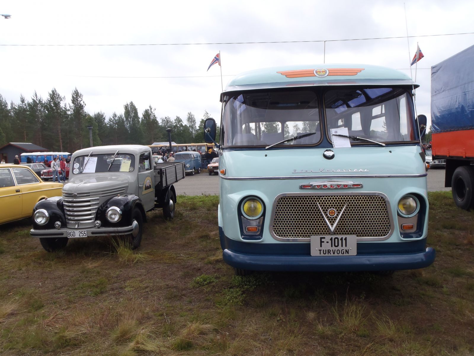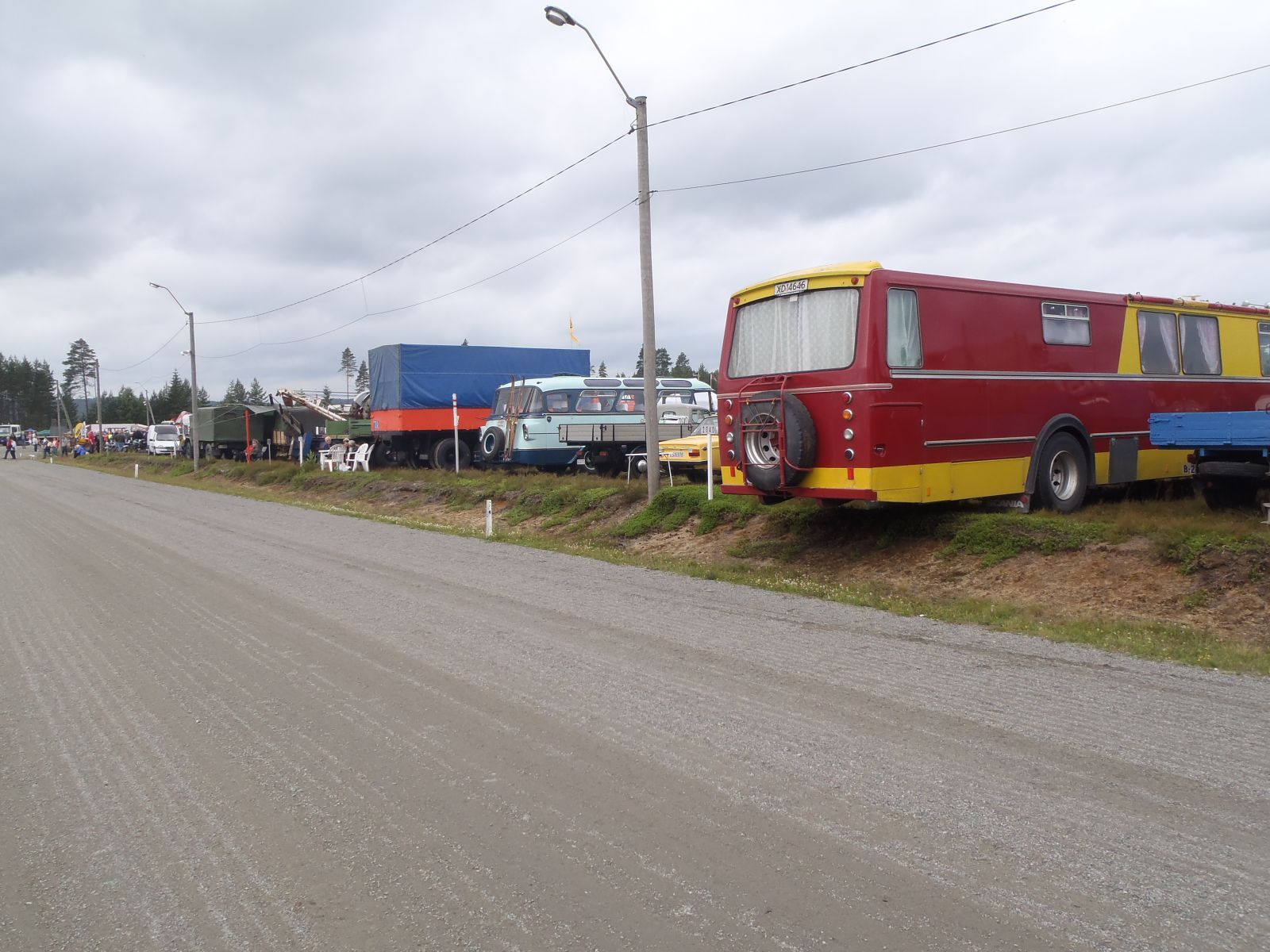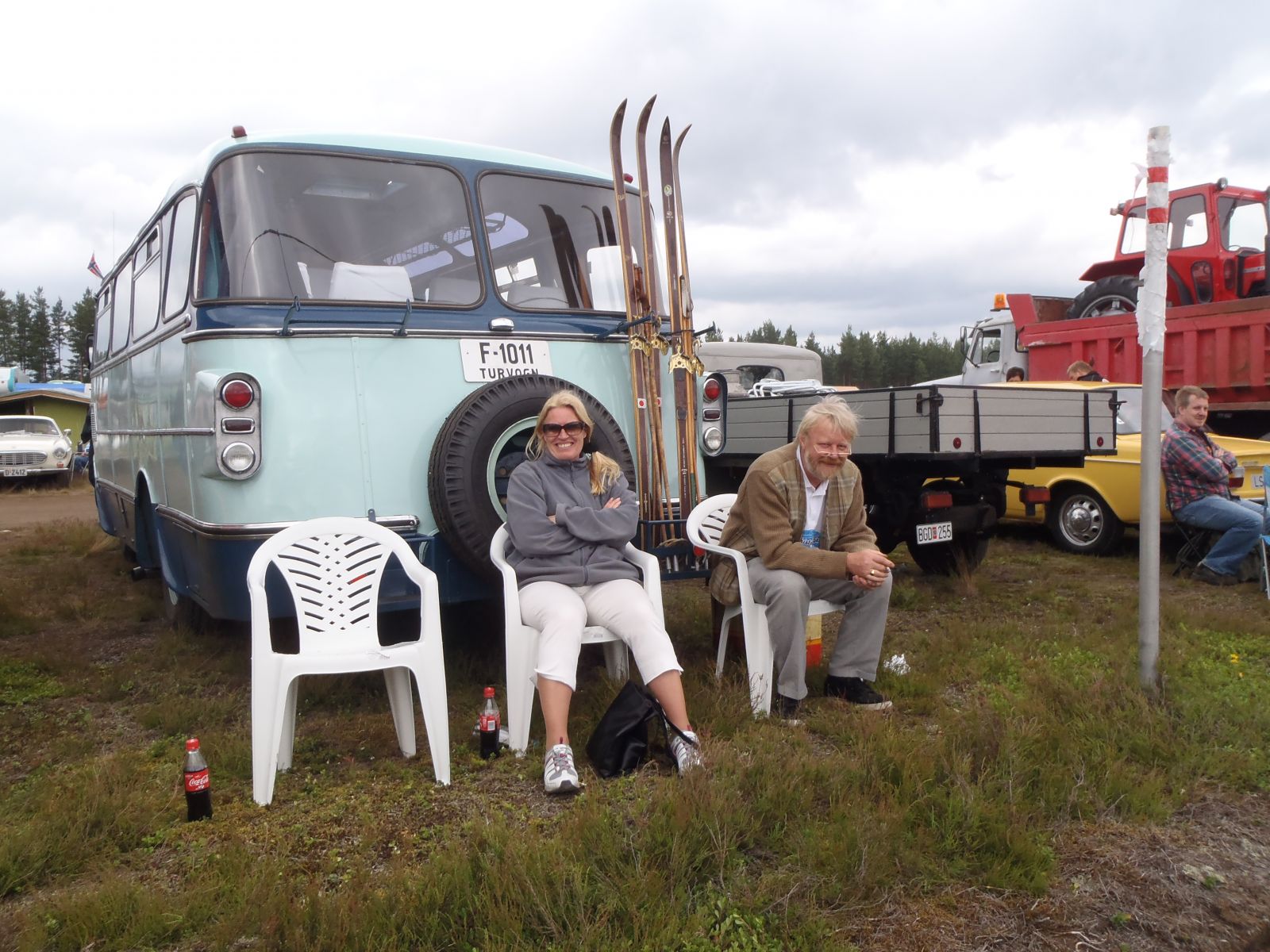 Grusomt mange som valgte å bli med til Magnor var det ikke..... Ingen andre kjøretøyer møtte opp på møteplassen, så det ble med oss fem personene i bussen. Hyggelig tur bortover i overskyet, men tørt vær. Vi passerte Magnor og tok en tur over til søta bror for innkjøp av nikotinholdige varer, bensin mm. Vi fylte 44 liter bensin, noe som betyr et forbruk på 2,44l/mil. Overraskende bra. Geir Enersen fra Lier Traktor har montert "Magnetizer" på bussen. Tross inngrodd skepsis begynner vi å lure på om produktet virkelig har en effekt. Sist vi målte brukte vi en liter mer!!! På travbanen på Magnor var det registrert innkjørt 879 kjøretøyer. Ikke noe småtteri altså. Herfra starter Vognmannen - løp for busser og lastebiler og Blårøykløpet (heter noe slikt antar vi) for mopeder. Til allmen beskuelse var utstilt vanlige personbiler, lastebiler, busser, mopeder, mortorsykler, traktorer, veihøvler, veivalser, stasjonærmotorer, lokomobiler - ja alt som tenkes kan. Vi rusla og gikk, traff mange kjente, spiste pølser og glante på rare folk. Mest artige hendelse skjedde nok likevel på vei bortover. En fører i passerende personbil var tydeligvis så betatt av vår vakre buss at han kjørte i autovernet på Skøyen. Drøye 40 mil gjennomførte bussen uten så mye som en antydning til problemer. Lars fikk lettere psykiske problemer av å se så mange lastebiler av merkene Scania og Volvo, men hans mentale helse ble stabilisert da han på hjemturen fikk se en Ford A-Serie dobbeltkabin.