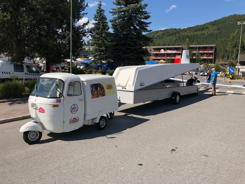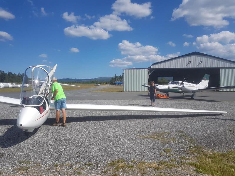 Så da blir det en tur til Klanten flyplass. Ikke noe dårlig verktøy på slike steder. Så sitter vi der og skravler og venter på han som looper og herjer oppi lufta. Ser på fly og det som naturlig hører til. Får innblikk i en annen spennende hobbyverden. Utleiehaien Knut, bilselgeren Asle og psykologen Stine. Hun som også flyr. Hun fikk nok noen faglige utfordringer med dette selskapet, men det var altså dagens andre påtrufne kjekke dame. Utleiehaien og bilselgeren lærte litt basis flykunnskap av henne. Bittelitt. Hvem visste at dagens moderne seilfly er utstyrt med motor? En liten en til å slå opp. Wankel av alle ting. Da trengs ikke noe slep. Slep på bakken er derimot nødvendig. Og at det er kraft i små spirrevipper synes tydelig på bildet nedenfor.