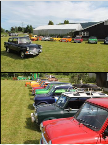 En liten hjulbeint grisefanger med fastmontert ekorn under nesa insisterte på at Mini-treffet i Solbergelva måtte besøkes etter avsluttet arbeid på Burud. Så gjort. På Buskeruds flateste plen fant vi en masse små biler og deres lykkelige eiere. Vi var litt sent ute så vi fikk ikke se alle, men ble av den harde kjerne fortalt at der hadde det vært mange.