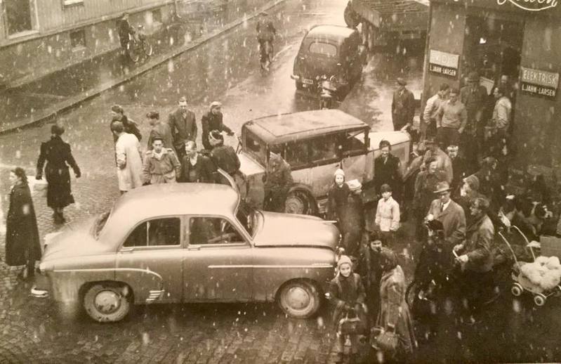 Kollidering har vel skjedd siden tidenes morgen. Man kolliderte sikkert med hest og kjerre, man kolliderer med bil, og nå for tiden kan man lese om alvorlige personskader etter kollisjon front mot front på tråsykkel...... Bildet til Arve Wiborg viser en liten smell i ovennevnte kryss i 1955. Tiltrakk seg mange skuelystne som man ser. Den nærmeste bilen er en ganske ny Vauxhall, den neste antagelig en 1930 Citroen og varebilen som står med rompa til er en Renault Colorale som også var ganske ny da bildet ble tatt. Den uheldige Vauxhall-eieren var Birger Haugen. Han drev Skotøymagasinet Solid på Bragernes Torg. Forretningen lå mellom Emil Jensen og gamle Drammens Sparebank. Birger Haugen er død, man hans kone Lillemor f. Haftorn lever fortsatt.
