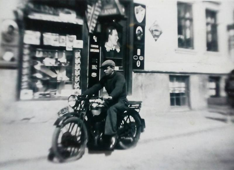 Sikkert noen som vet hva slags motorsykkel dette er. Det er i allefall en flott stilstudie. Rytteren het Frank Klemetsen og var født i 1916.