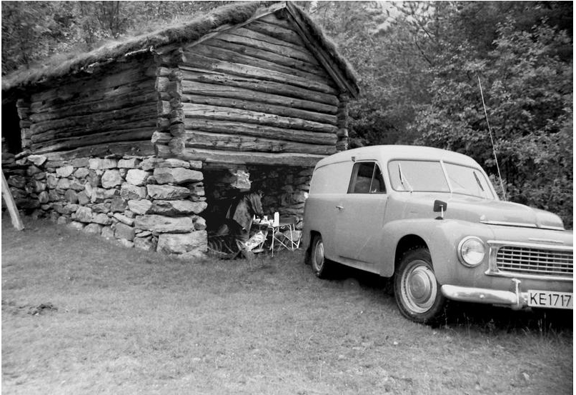 Vedlagte bilde er motorhistorisk og viser Viker´ns Volvo Duett på Vestlandsturen jeg nevnte i minneordet om Øivind. Men samtidig verifiserer bildet at vi faktisk spiste lunsj i en møkkakjeller, om noen skulle tvile på sannheten i historien.