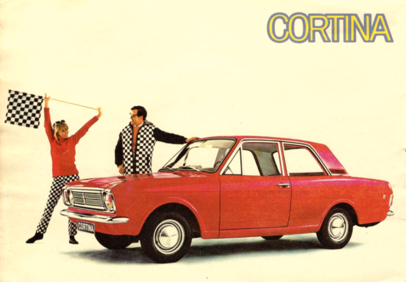 Fra introduksjonen av Cortina Mark 2 høsten 1966. Her i GT-versjon uten Minilite og annet ræl som folk setter på bilene i dag. Klærne derimot er det ingen som har. Dere som er så heldige å ha en slik Cortina og endog ei sømkyndig kjerring, dere må sette i gang umiddelbart. Hadde jo vært knalltøff bekledning på tur. Racerbilen Cortina GT gjorde null til hundre på 13,5 sekunder, hvilket betyr at den blir slått av de fleste varevogner i dag. Det ble skrytt av at varmeapparatet var en liten genistrek. Og med rette. Man finner ikke en eneste bil i 2019 som har et så godt varmeapparat. Ingen man med stor glede kan dra sidelengs gjennom svingene heller for den saks skyld. Heldige er vi som har kunnet holde på med sånt uten at messingen brød seg nevneverdig.