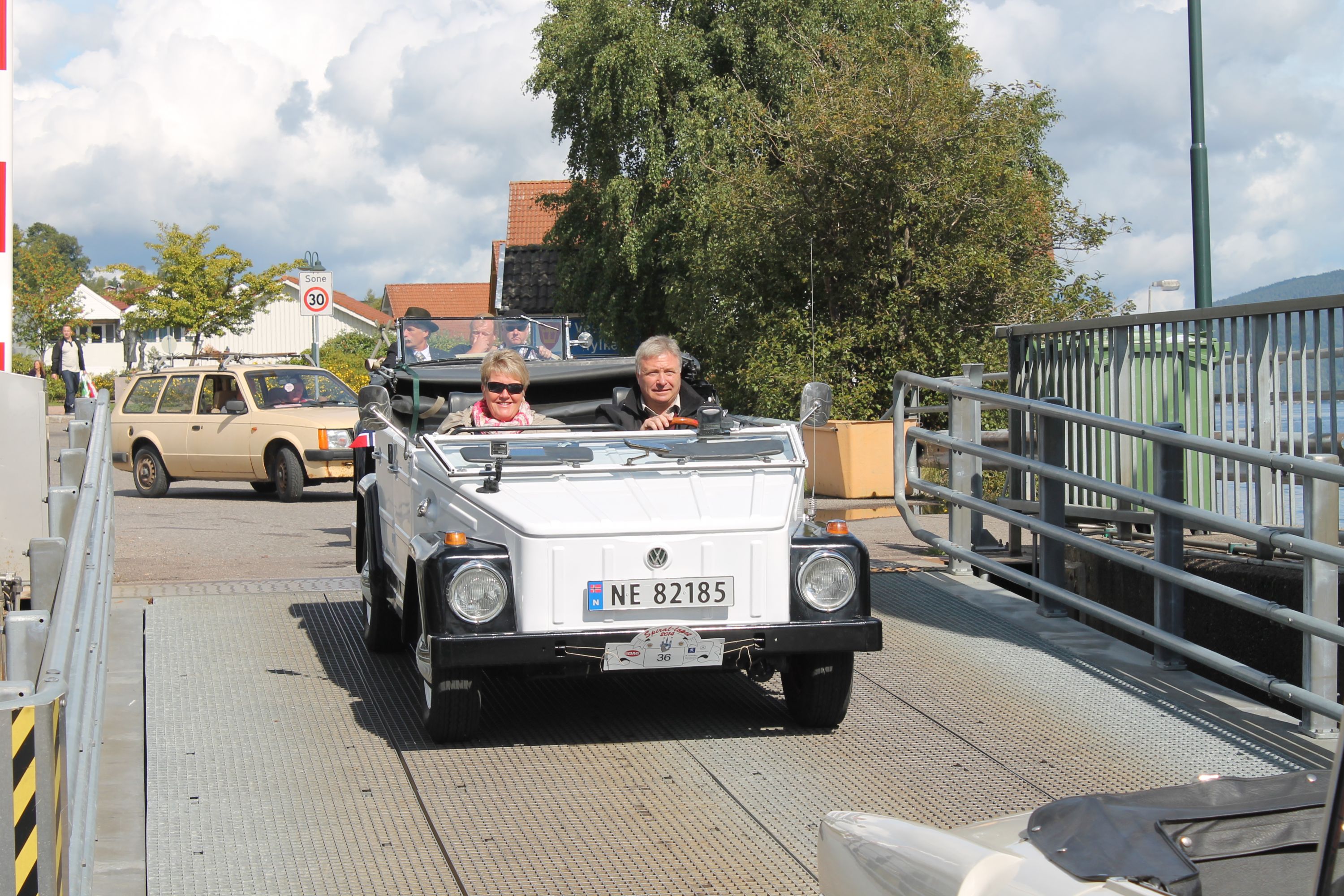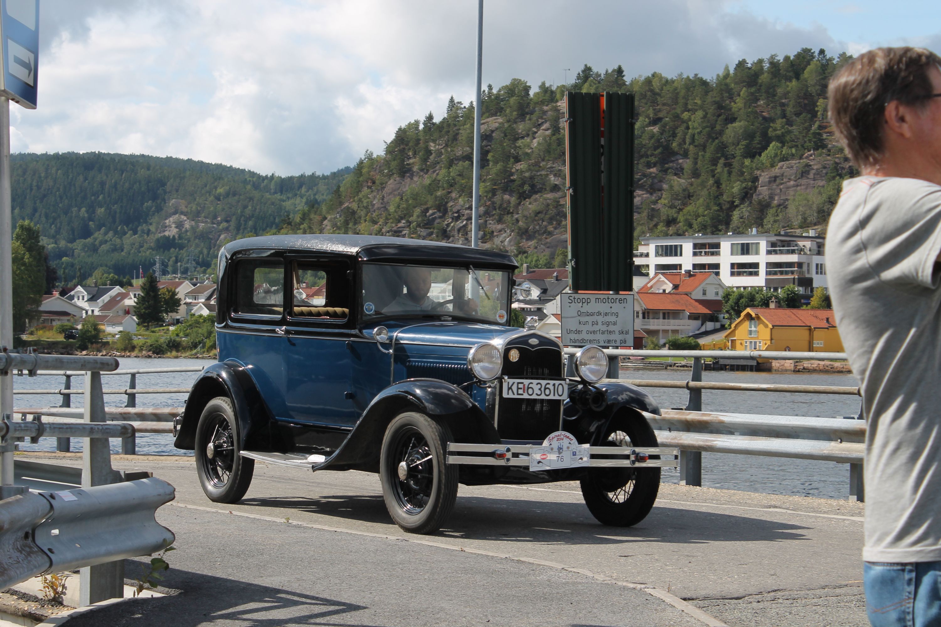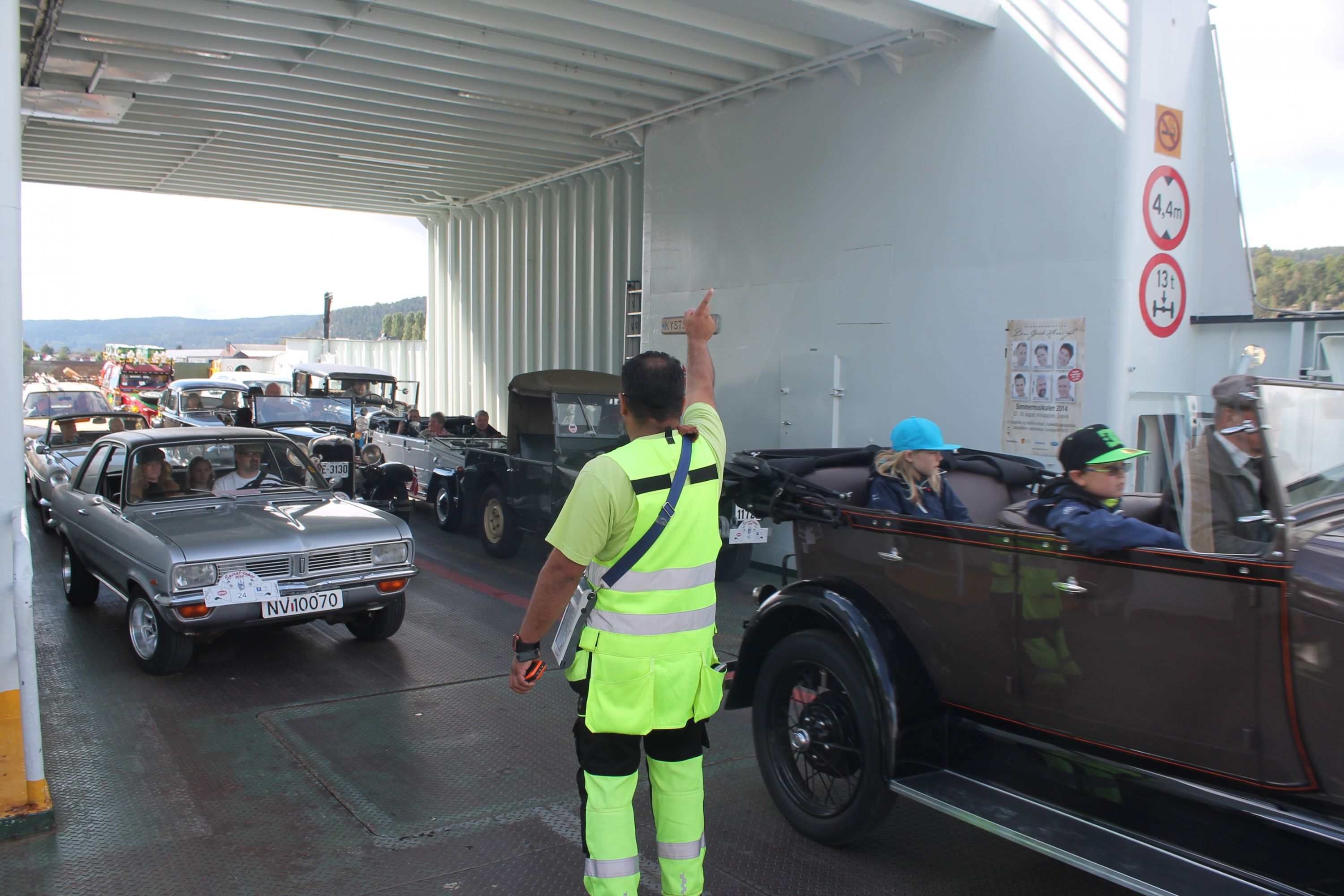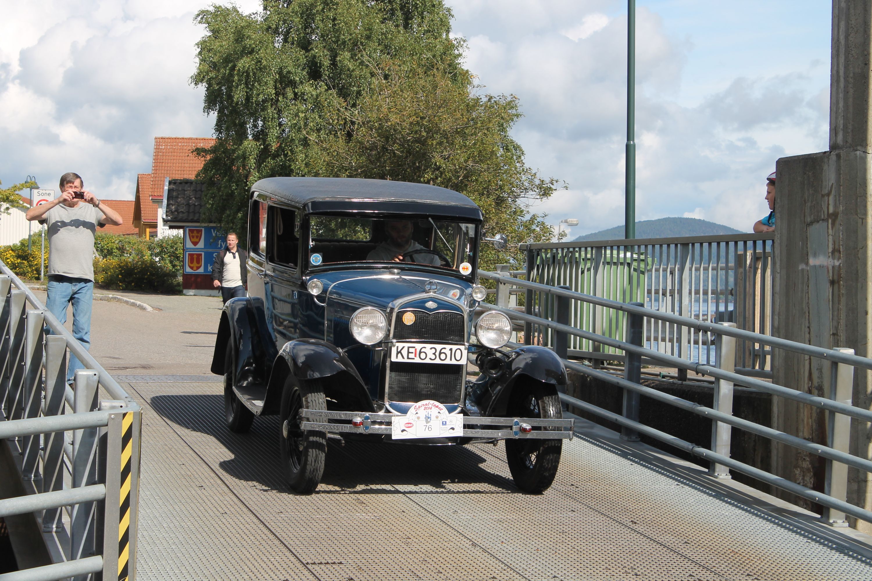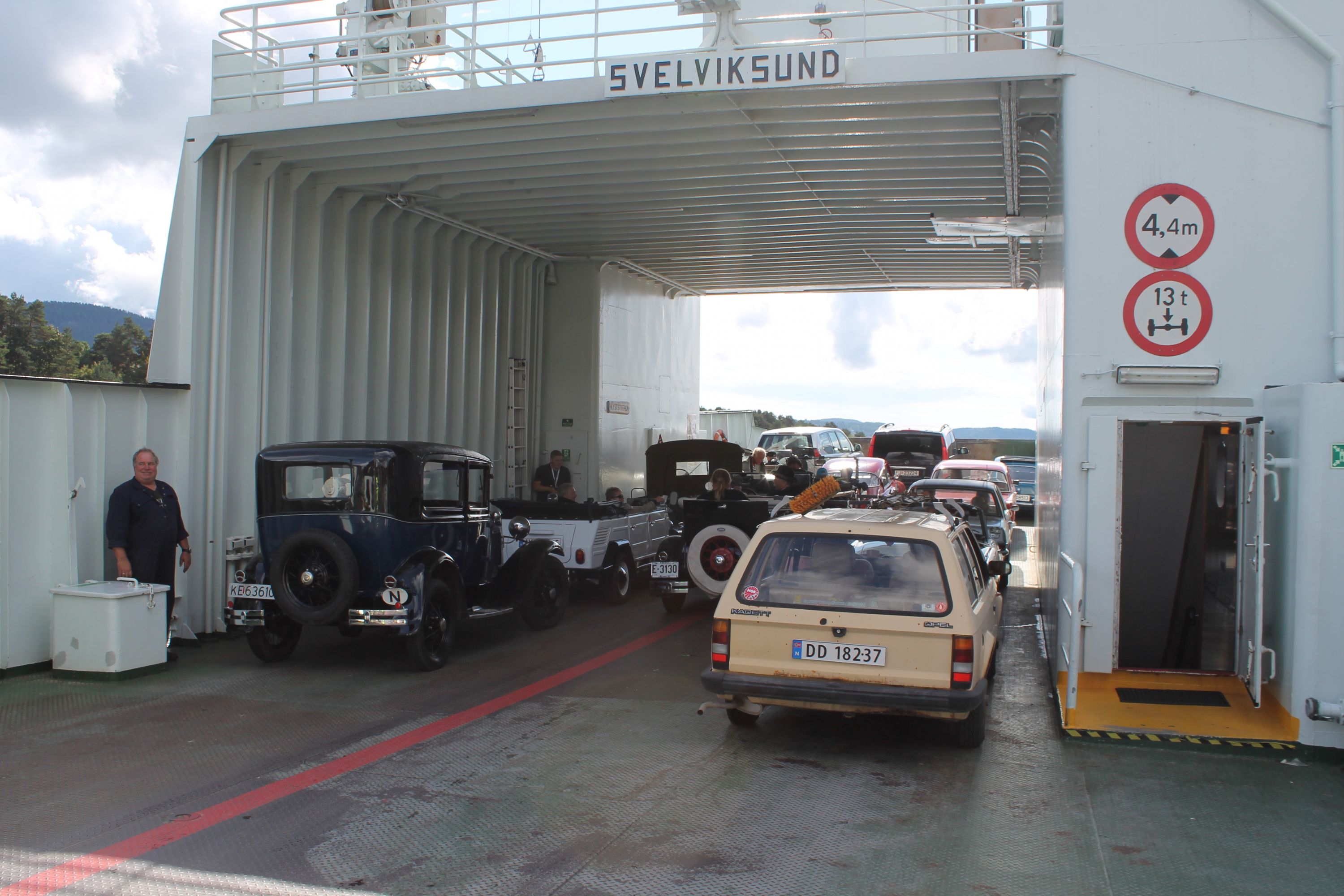 Løypa gikk iår ut Drammensfjorden. Annenhver deltager ble sendt hhv sør- og nordsiden til Verket og Svelvik. Vi som kjørte RV319 til Svelvik hadde første post på Syvertsvollen der oppgaven var å sentrere høyre forhjul mot en strek på et bord av impregnert gran. Sto en svær atlet av en mann i veien der og passet på trafikken. Han sendte oss myndig videre mot den pittoreske småbyen Svelvik, byen som kan skilte med såvel Kiwi-avdeling som Vinmonopol. På kaia til Svælvikfærja påtraff vi Kjell Thon og hans mannskap som påla alle deltagere å identifisere en haug med bilmerkers logo. Vi kjørte så ombord i fergen. Lite er så romantisk som fergetur med gammalbil i strålende vær. Synd turen var så kort. På soldekket var det kun bil nr 76 sine passasjerer. Hva dere andre gikk glipp av! Nydelig utsikt fra velstelte tykke stålplater. Vi savnet noen bunnies med paraplydrinker og et temperert basseng, men innser at vi ikke kan forlange alt for en beskjeden startkontingent.