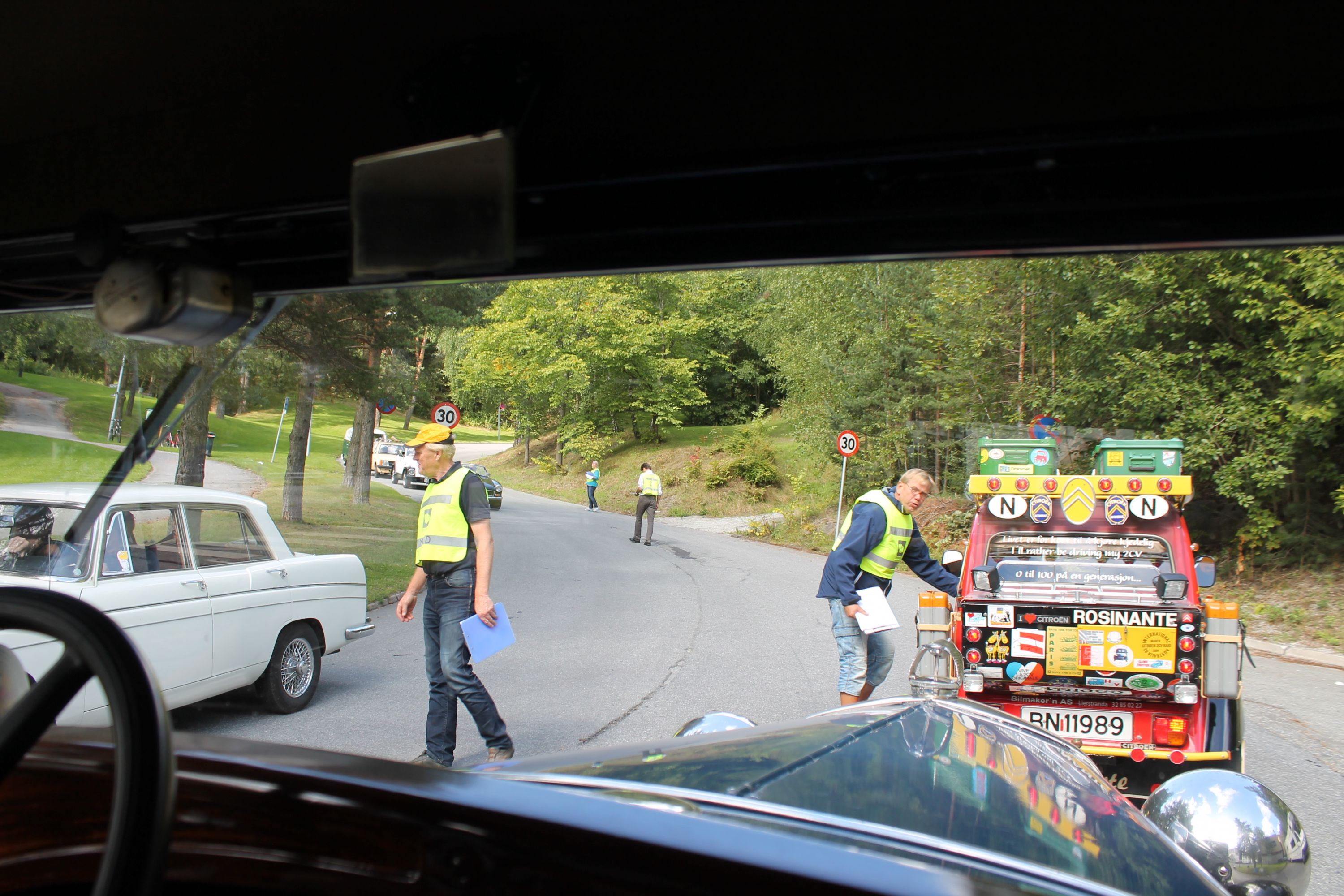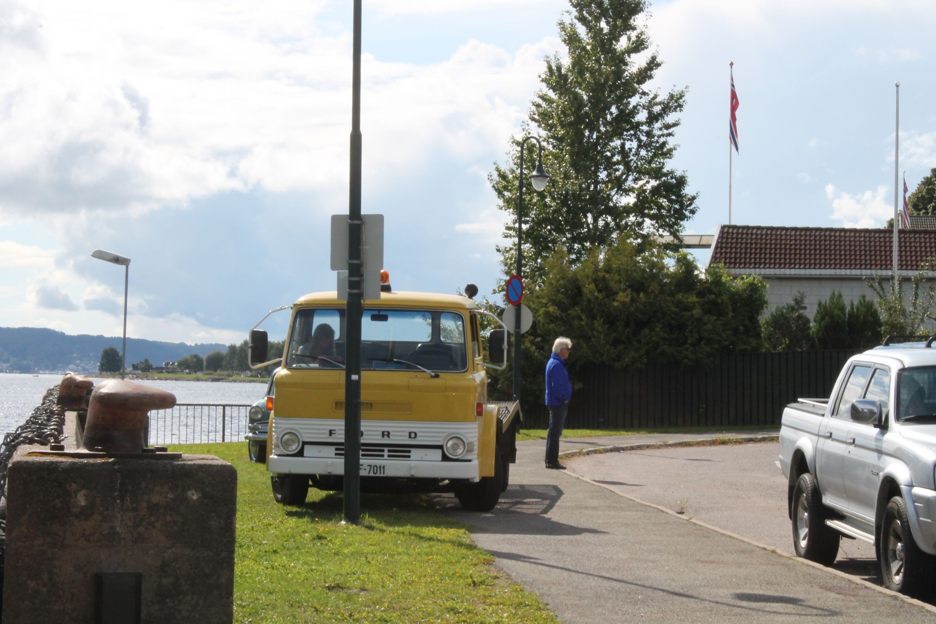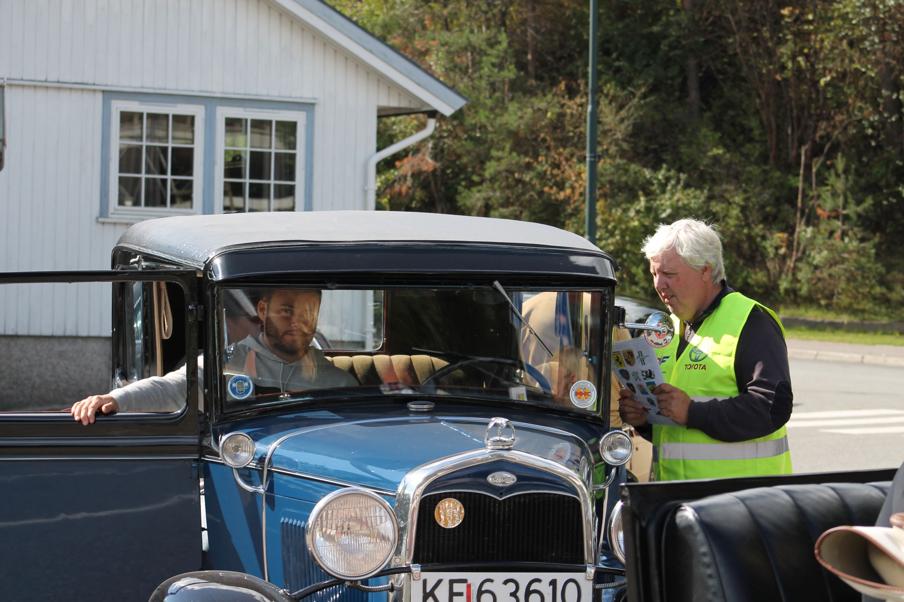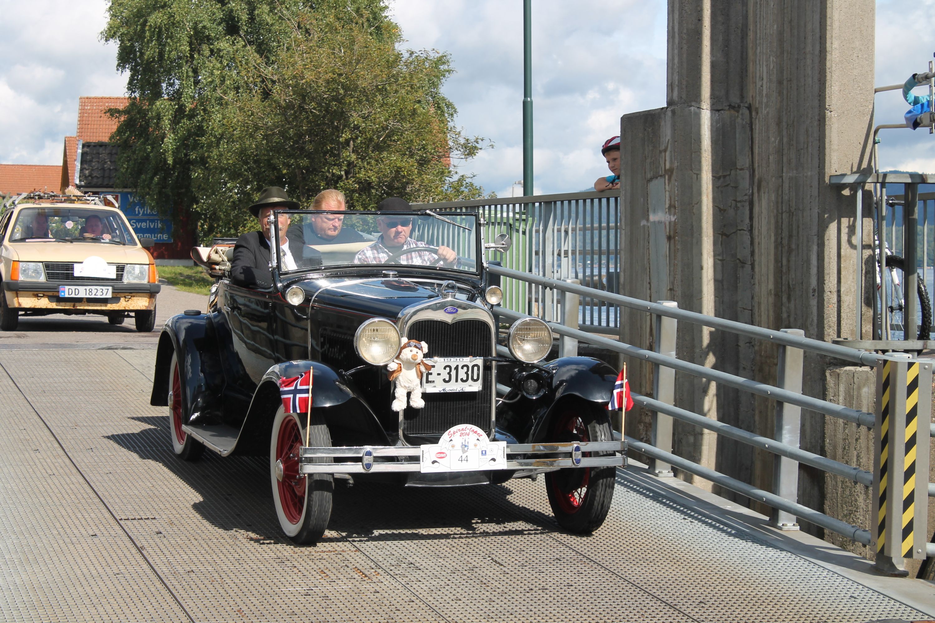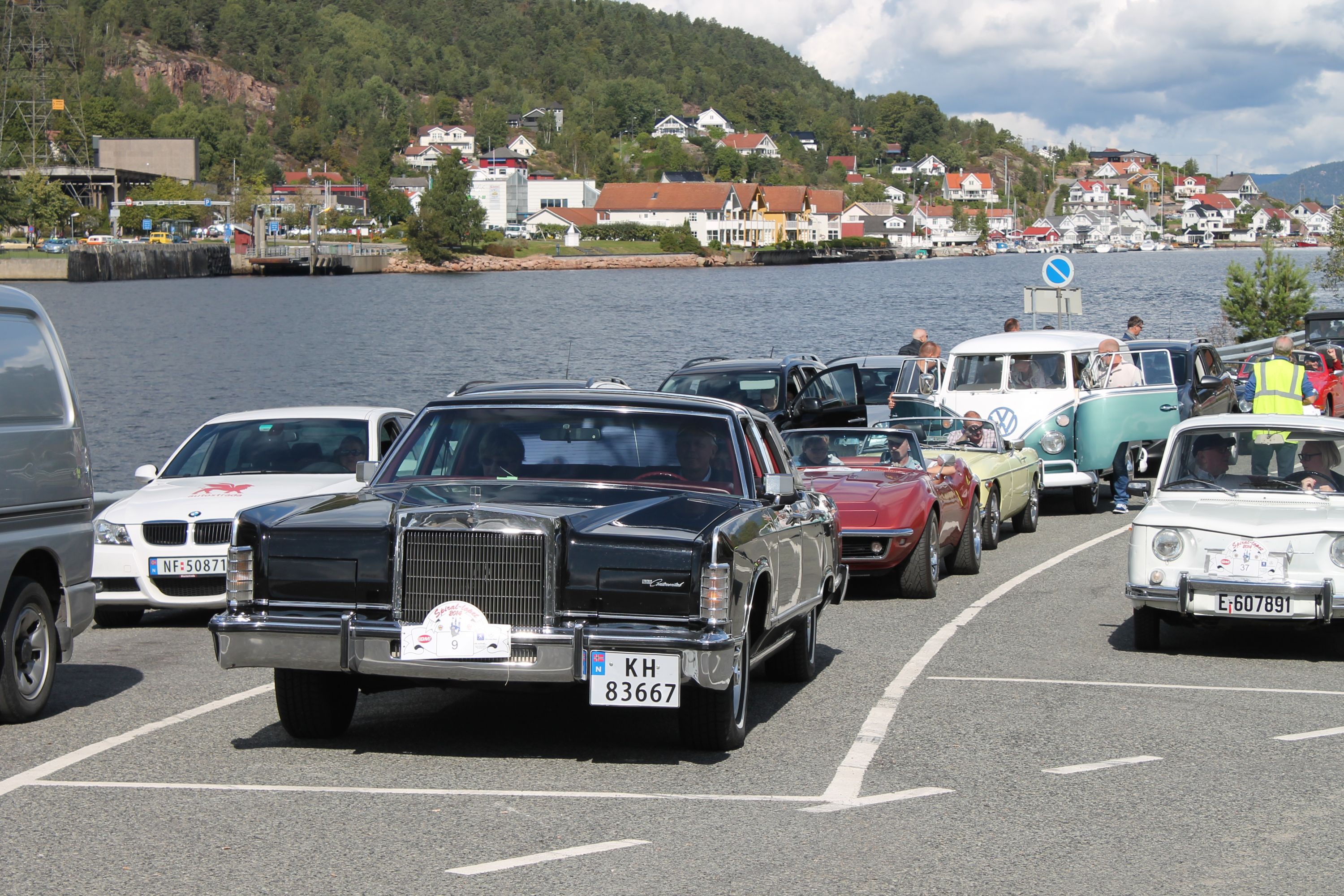 Løypa gikk iår ut Drammensfjorden. Annenhver deltager ble sendt hhv sør- og nordsiden til Verket og Svelvik. Vi som kjørte RV319 til Svelvik hadde første post på Syvertsvollen der oppgaven var å sentrere høyre forhjul mot en strek på et bord av impregnert gran. Sto en svær atlet av en mann i veien der og passet på trafikken. Han sendte oss myndig videre mot den pittoreske småbyen Svelvik, byen som kan skilte med såvel Kiwi-avdeling som Vinmonopol. På kaia til Svælvikfærja påtraff vi Kjell Thon og hans mannskap som påla alle deltagere å identifisere en haug med bilmerkers logo. Vi kjørte så ombord i fergen. Lite er så romantisk som fergetur med gammalbil i strålende vær. Synd turen var så kort. På soldekket var det kun bil nr 76 sine passasjerer. Hva dere andre gikk glipp av! Nydelig utsikt fra velstelte tykke stålplater. Vi savnet noen bunnies med paraplydrinker og et temperert basseng, men innser at vi ikke kan forlange alt for en beskjeden startkontingent.