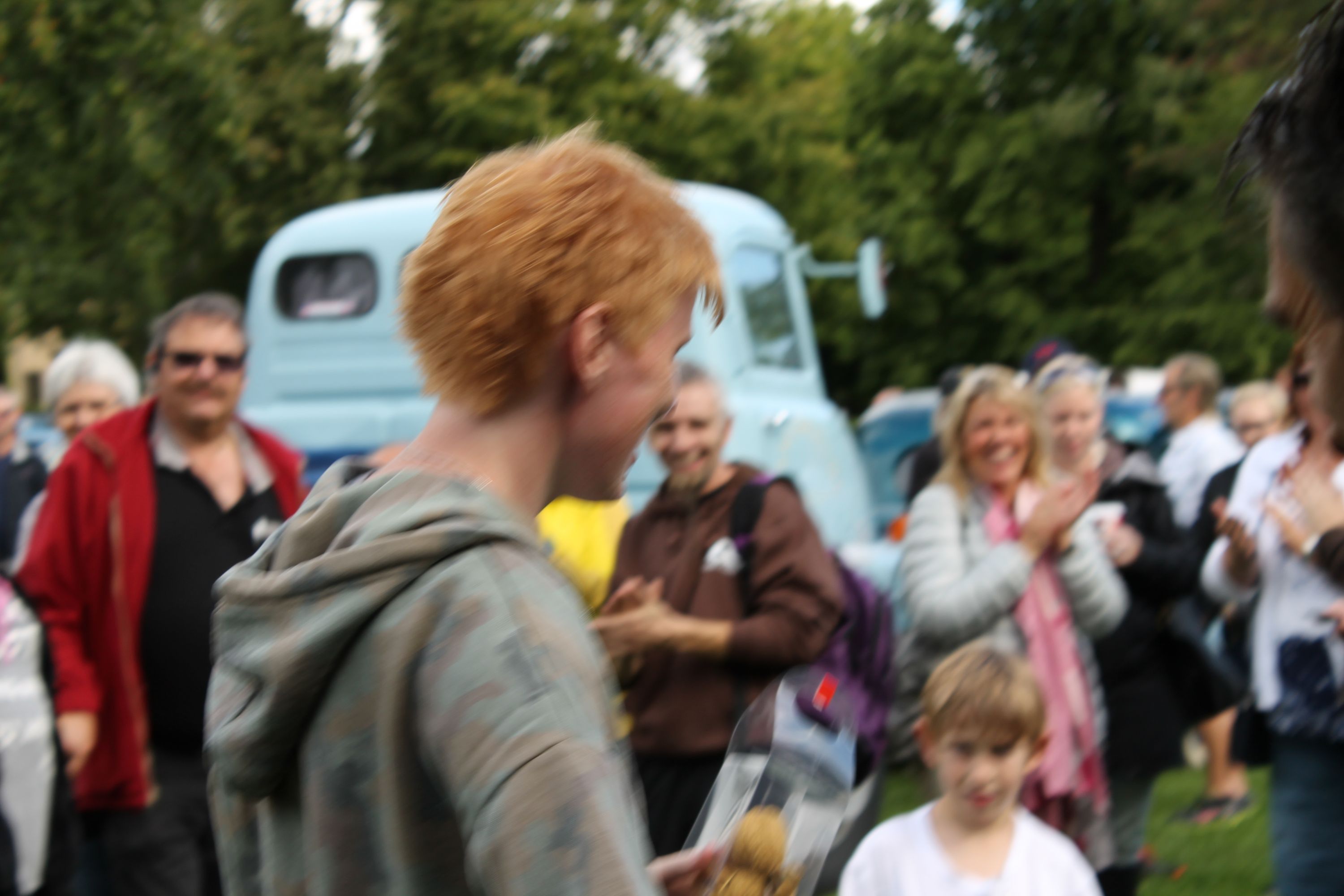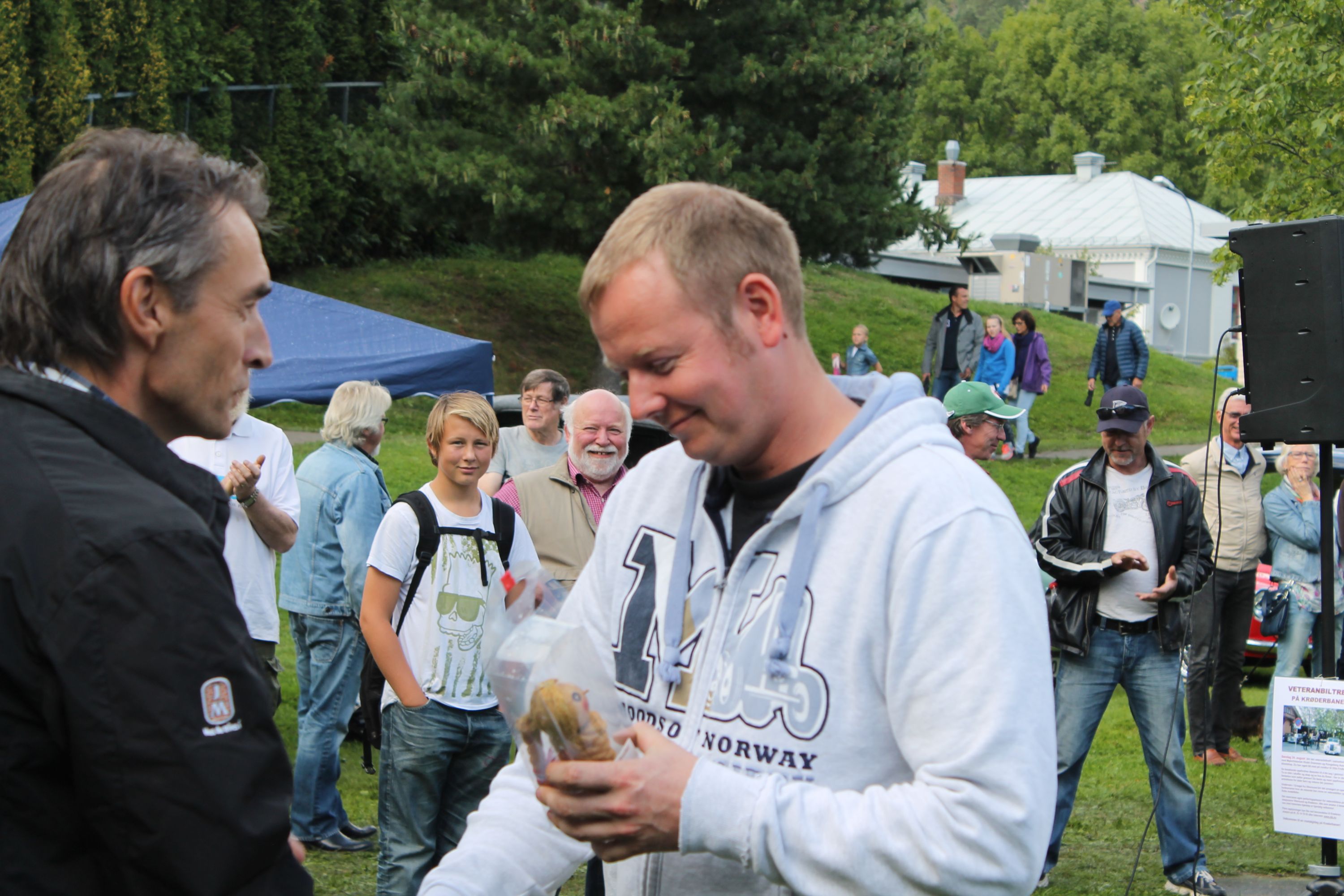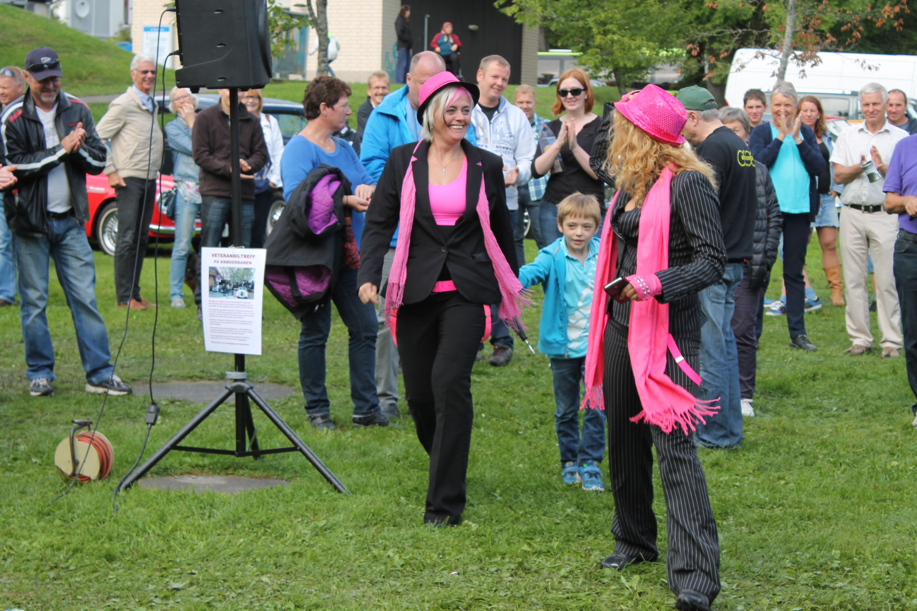 Så bar det inn mot byen igjen. Med dispensasjon til å kjøre mot forbudsskilt. En deilig opplevelse. Siste post skulle ha vært på Spiraltoppen som vanlig, men vårt åndssvake samfunn satte en effektiv stopper for det. Som kjent er alt fali'. Spiralen har i alle år blitt kjørt opp og ned i ulike hensikter. Så fant noen lyse hoder ut at det måtte installeres brannvarslingsanlegg i denne vesle tunellen. Og når det ikke virker så blir det stengt av noen - unnskyld uttrykket - idioter i den kommunale administrasjon. Alt har blitt farlig og det meste er forbudt..... Nok om det - ned i parken igjen med premieutdeling til store og små. De små fikk som vanlig velge fritt på premiebordet. Sjåførpremiene ble utdelt i høytidelige former og de ti beste fikk hver sitt trøll. To premiemottagere av den impulsive sorten utmerket seg og satte en fin spiss på arrangementet. Vinner av tiendepremien Heidi Skau jublet så det klirret i gatelysa og Die Trabi-mädchen som mottok premie for beste antrekk var et nydelig skue