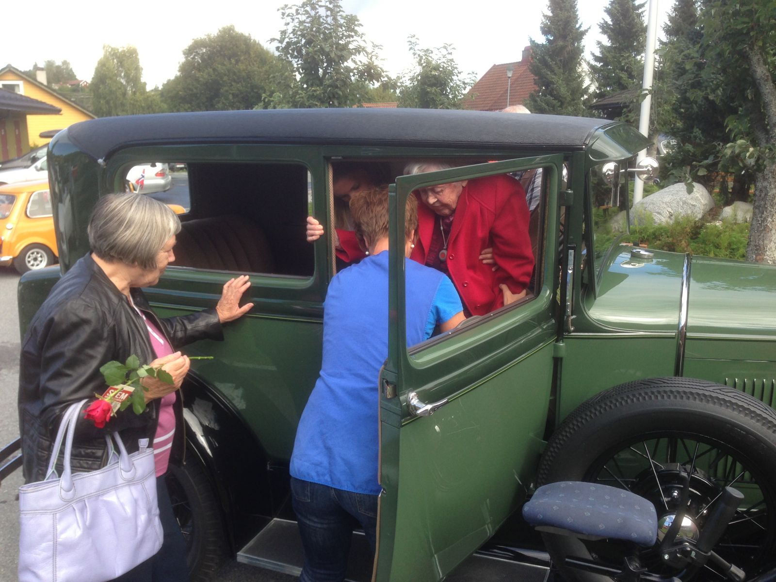 Deretter bar det hjem med de gamle hvor middag ventet. Eldste passasjer fant vi i Vidar Grønli sin gamle A- Ford, ei sprek dame på 99 år, og i Arne Bråten sin 33 modell Buick satt det ei kjekk jente på 96 år. I Tom Persons Mini satt det også ei gammel dame, så ingen bil er for liten for en slik kjøring.