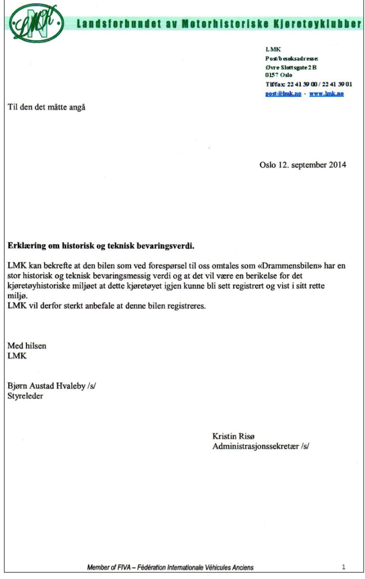 Idag har redaktør og dugnadsgeneral Wang fått mail fra LMK. Med dette dokumentet i hånd skal det være noe bortimot sikkert at vi kan få skilter på verdens eneste eksemplar av Drammensbilen. Er det ikke fantastisk?