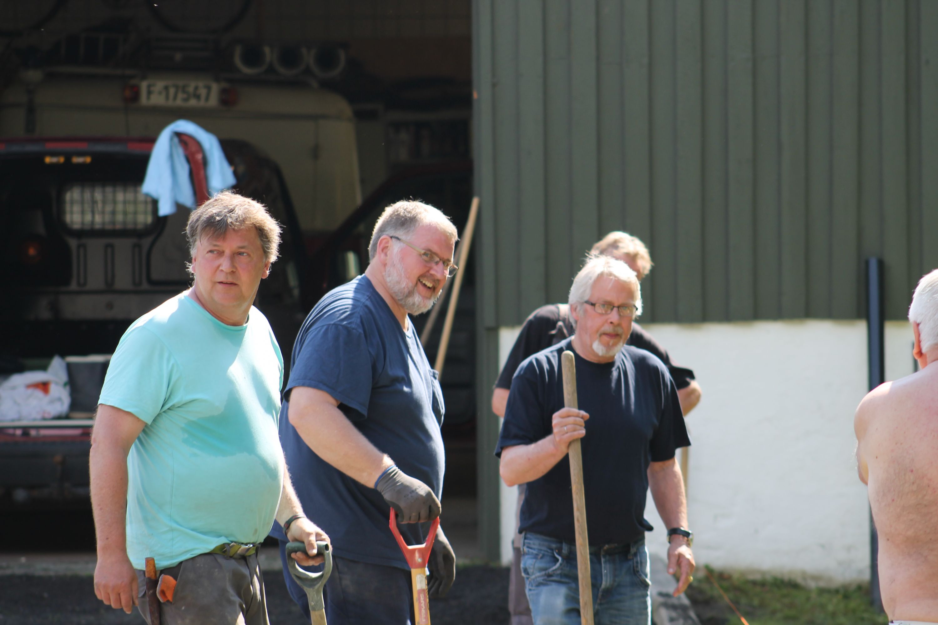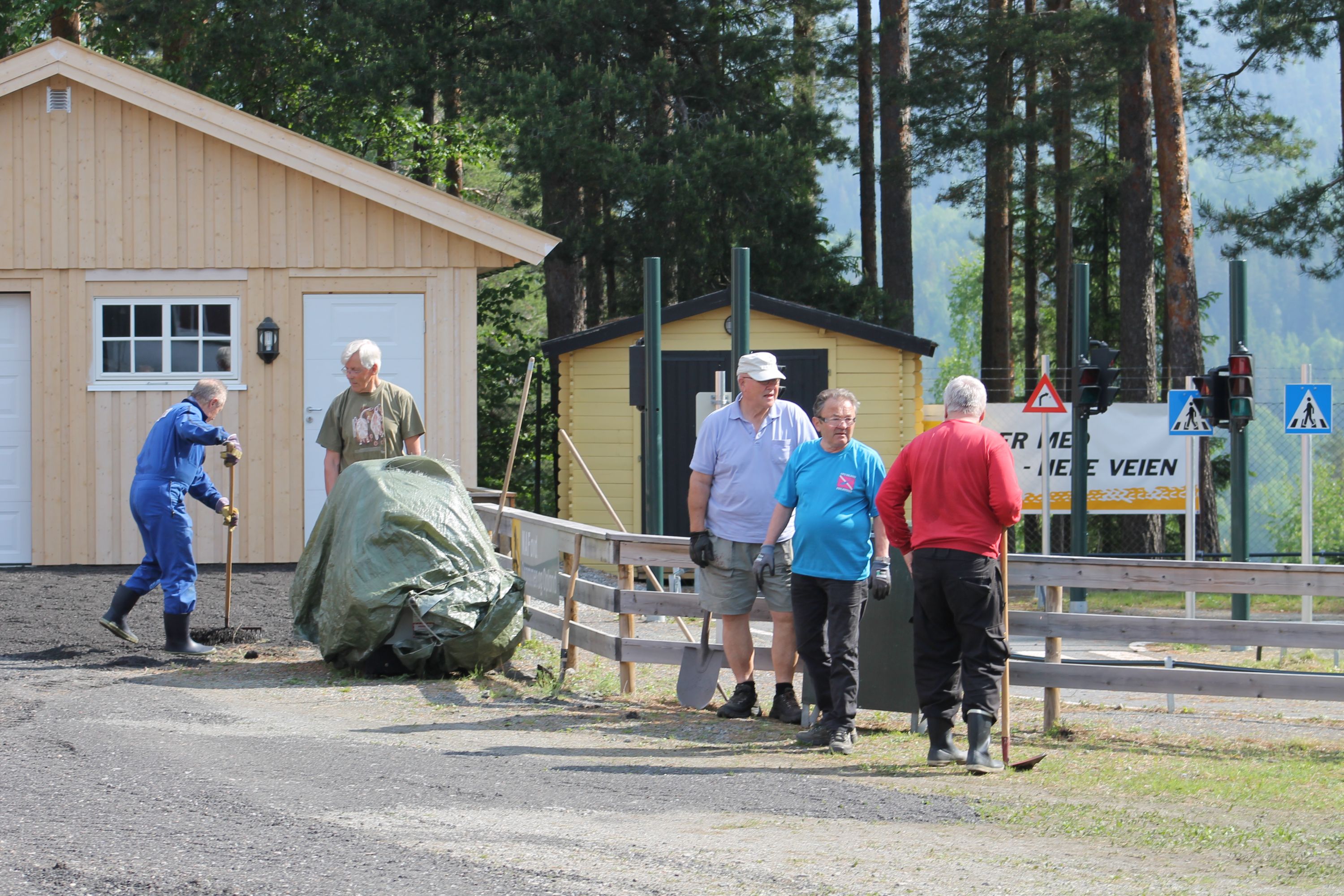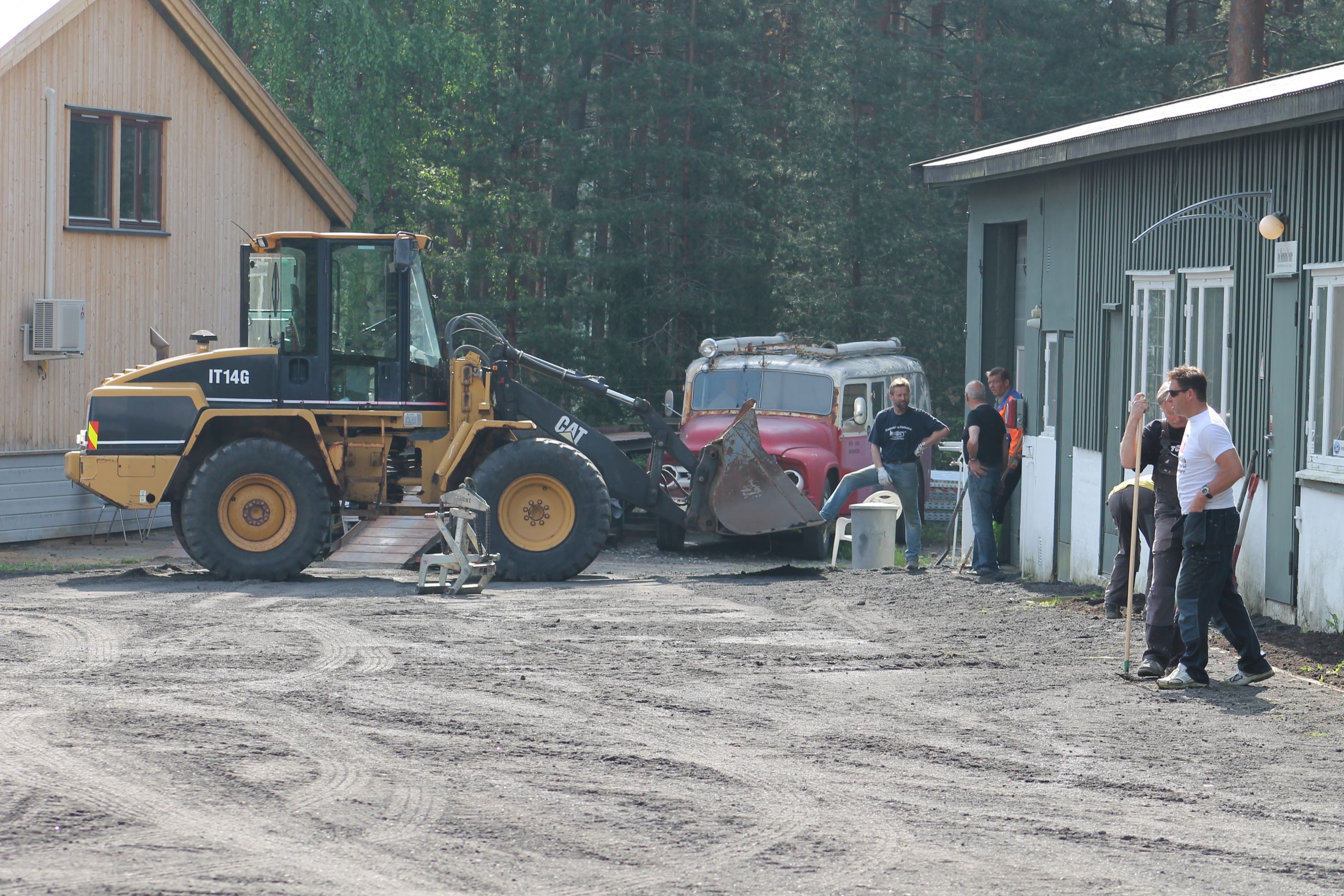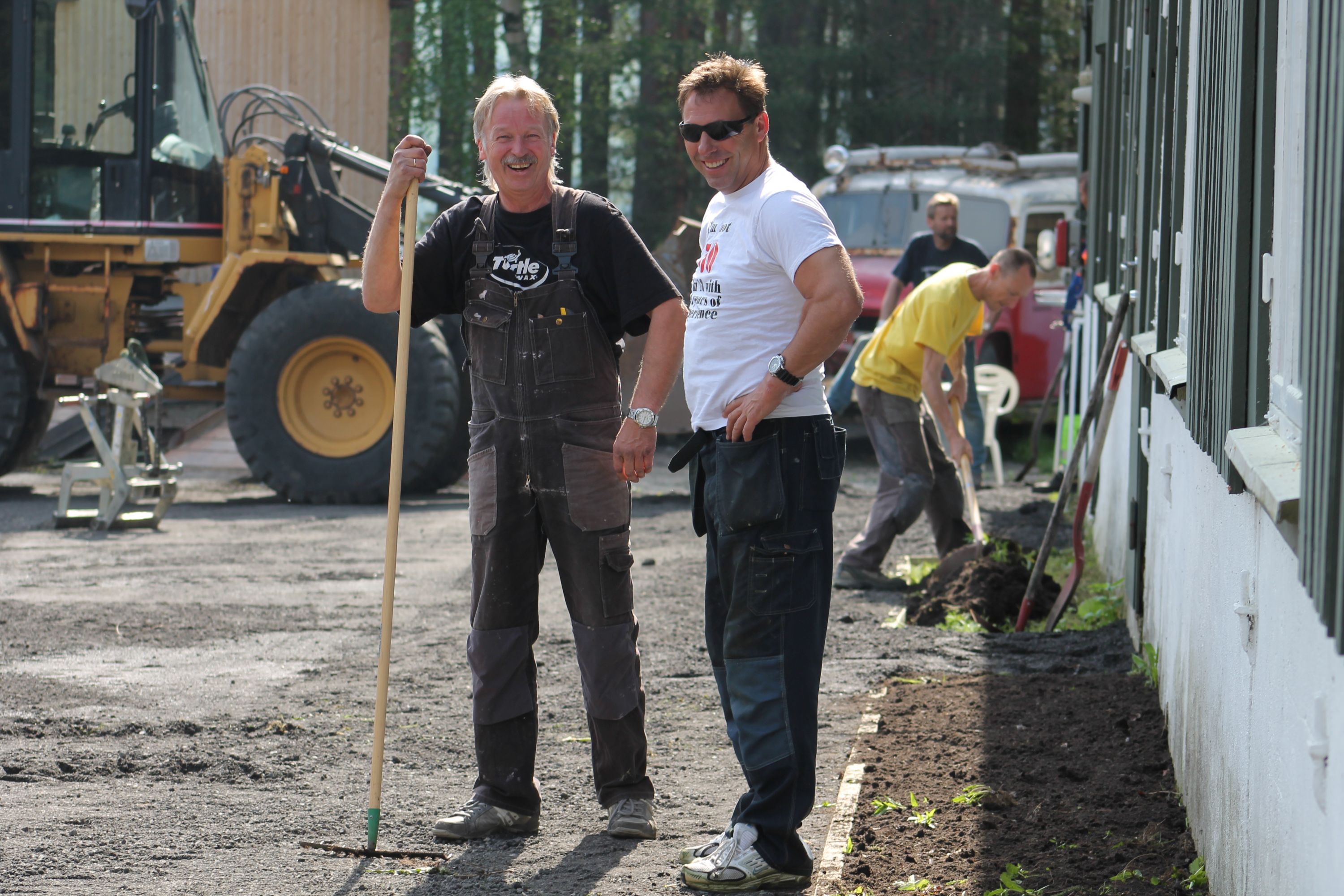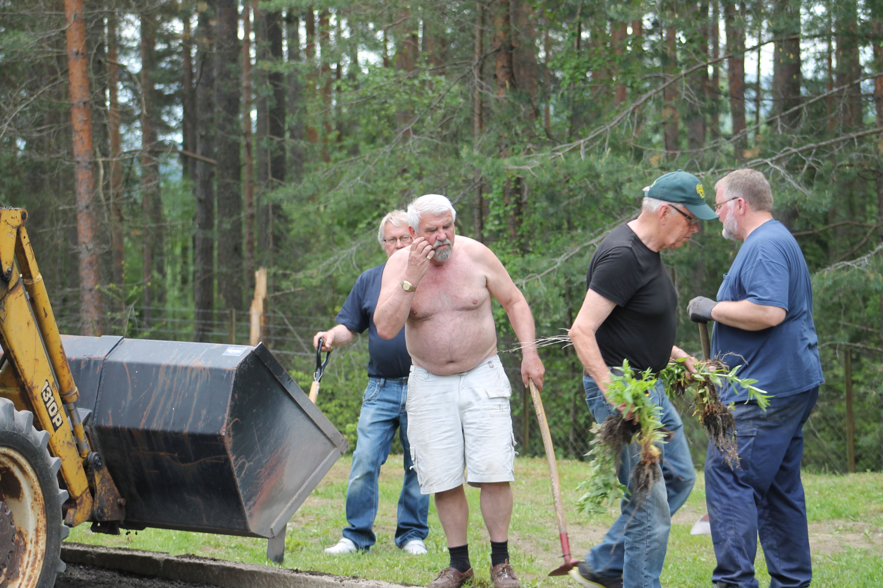 Det er vanskelig å fremheve noen, men de som bidro med det mest synbare og ikke minst tyngste arbeidet var våre tre maskinførere. Uten dere hadde dette prosjektet vært nytteløst. Hans Jørgen Jørgensen stilte med sin gravemaskin og sin lastebil, Bjørn Sønju som hadde med traktor med skjær og laster, og Trond Kristensen som førte hjullasteren vi hadde fått låne av Olve Teigen. Hans Jørgen gravde grøfter for legging av kantstein og løftet disse på plass, han senket nivået litt foran hall 3 og planerte bak samme hall. Bjørn kjørte matjord, kjørte og planerte asfaltfres. Trond la ut 270 tonn asfaltfres - resten går på andre dugnadsdag - og han flyttet på 2-3 bilvrak mm.