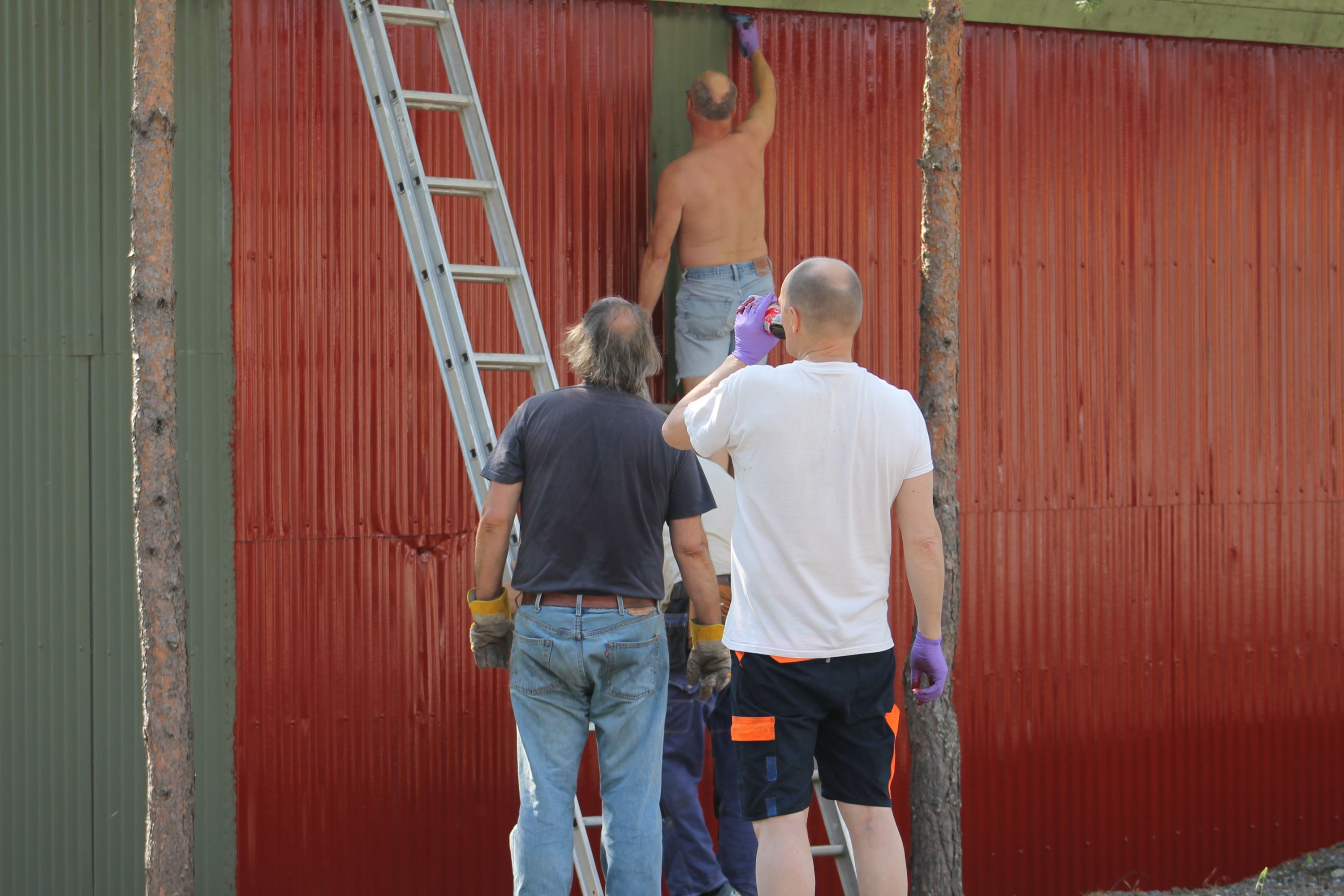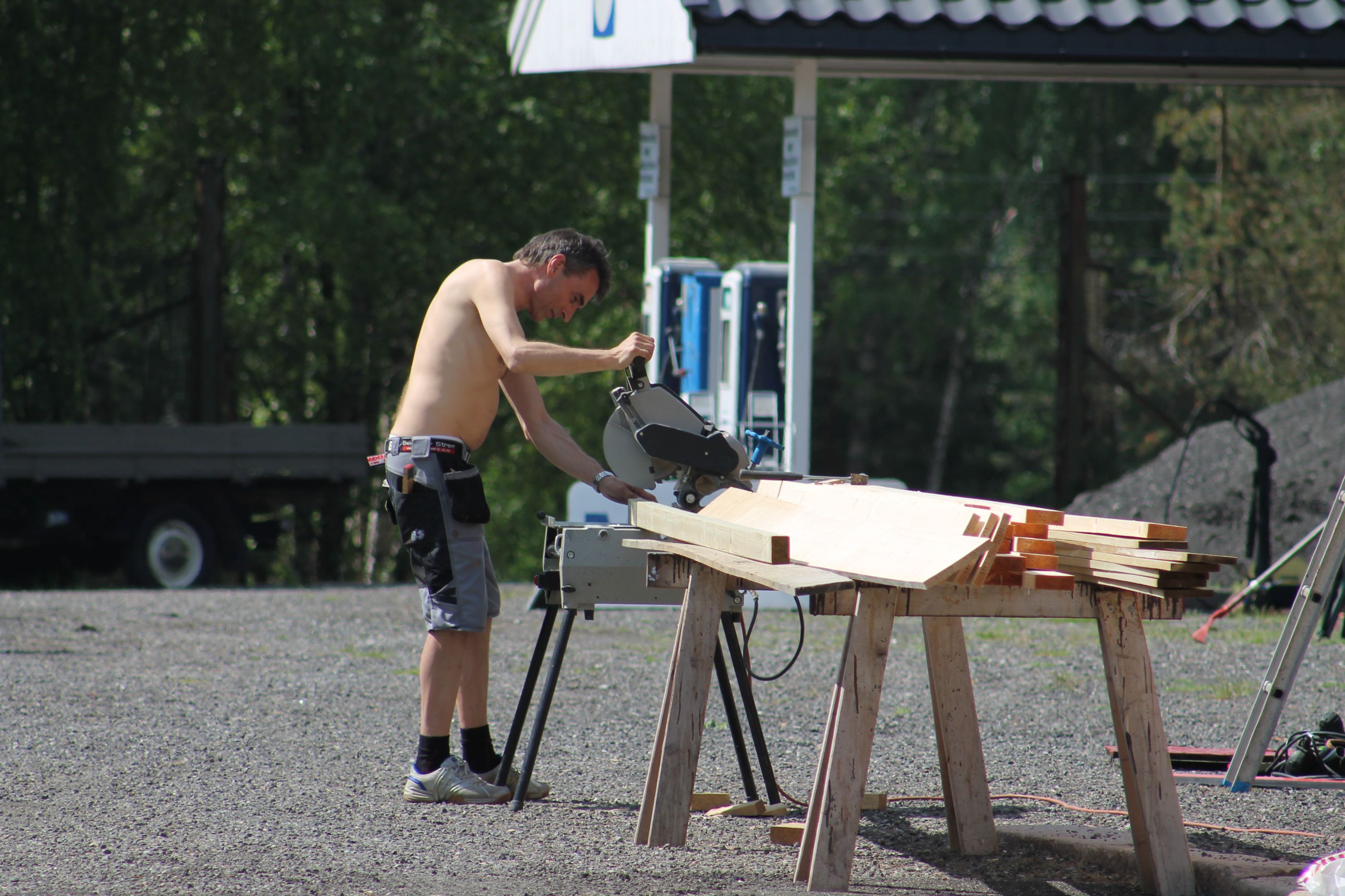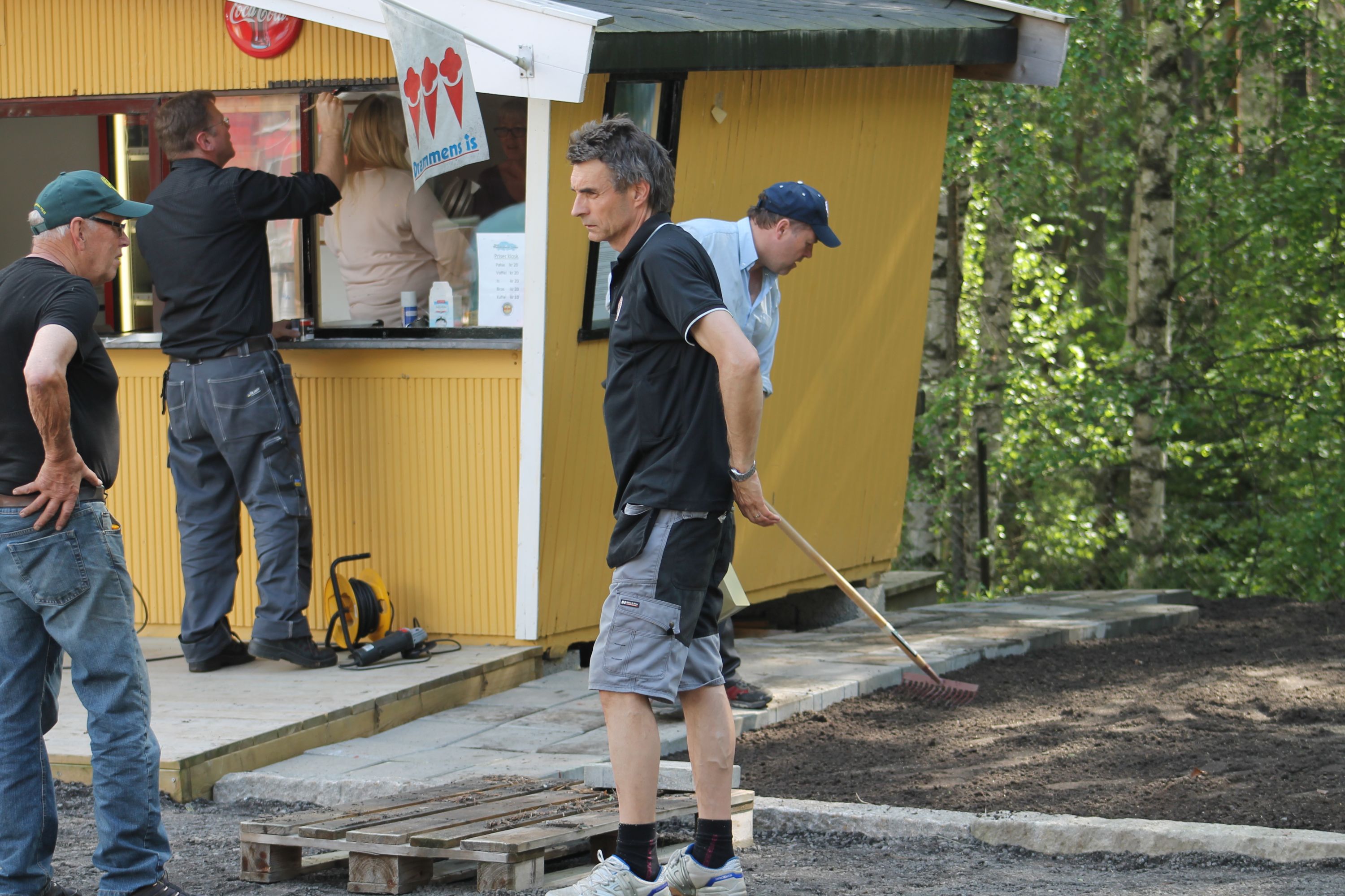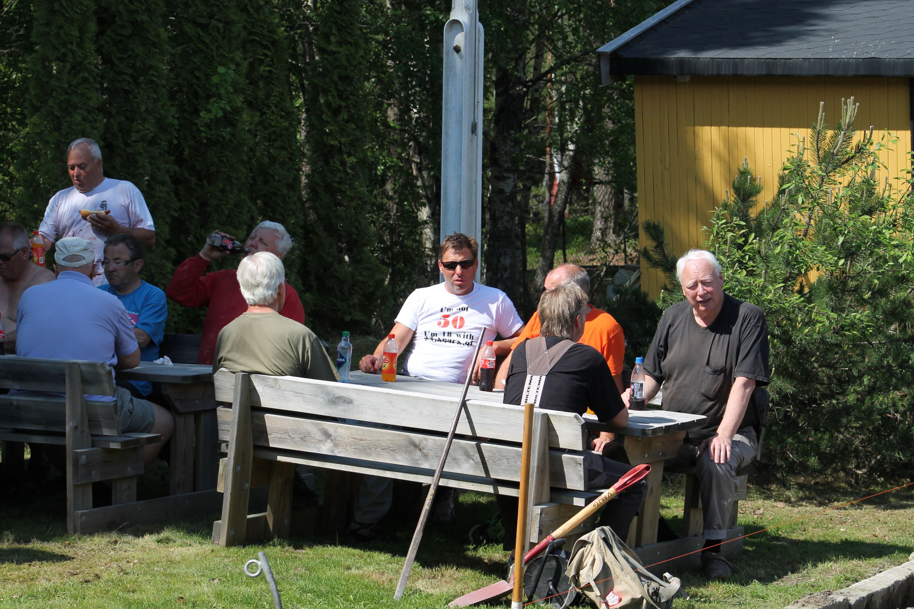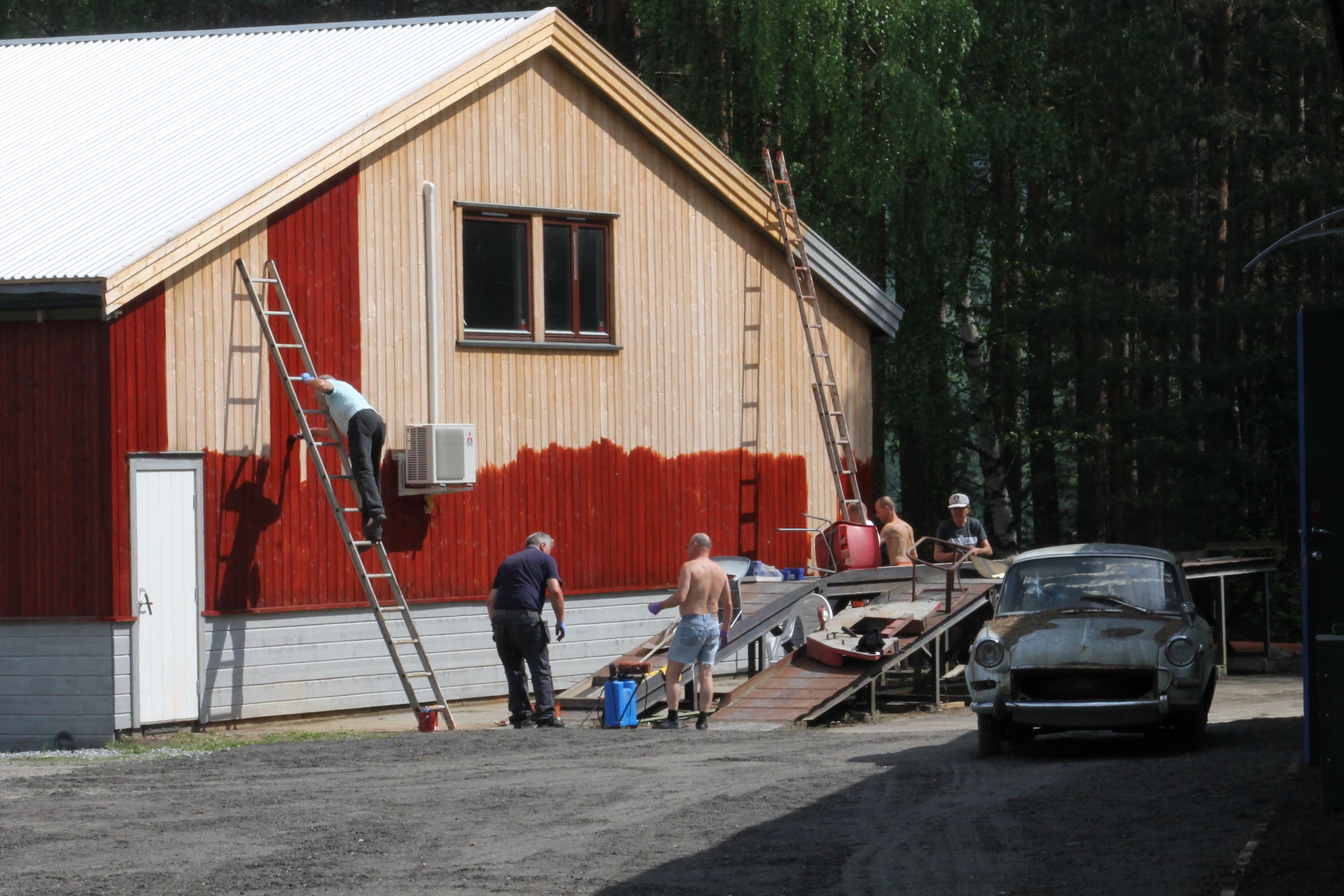 Hva fikk vi så gjort på disse timene? Og hvor mange timer? Vi jobbet denne dagen anslagsvis i timer hva en mann bruker åtte uker på. Skal vi veldig forsiktig sette en verdi arbeidskraften og maskinbruken så er denne lørdagens arbeid verdt et sted mellom kr 150.000 og 200.000,- Sol dere i glansen dere som har vært med. Og hva har vi fått gjort? Vi har som nevnt kjørt ut 270 tonn asfaltfres, 3 tonn matjord, vi har under malermester Tore Fridheims ledelse fått malt utallige kvadratmeter og vi har fått utført en masse snekkerarbeid. Blant andre ting...