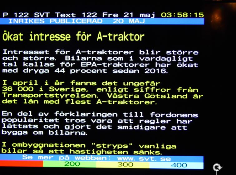 På svensk tekst-TV kunne vi for en tid tilbake lese ovenstående nyhetsmelding, hvor vi får vite at de svenske A-traktorene -også kalt EPA-traktorer- øker i popularitet og i antall. Her kan man modifisere en helt vanlig personbil og kjøre rundt i den fra man er 16 år. Kravet er at man har førerkort for traktor – og at "bilen" ikke kan gå fortere enn 30 km/t. Metodene man benytter er for eksempel at man plomberer gearet til å bare fungere på første og annet gear, eller ved å strype inn på drivstofftilførselen. Om bilen har automatgear, må det monteres en ekstra boks etter gearkassa som en slags fartsreduksjon. Alle kjøretøyene skal også være utstyrt med et merke bak som forteller at dette er en A-traktor.
