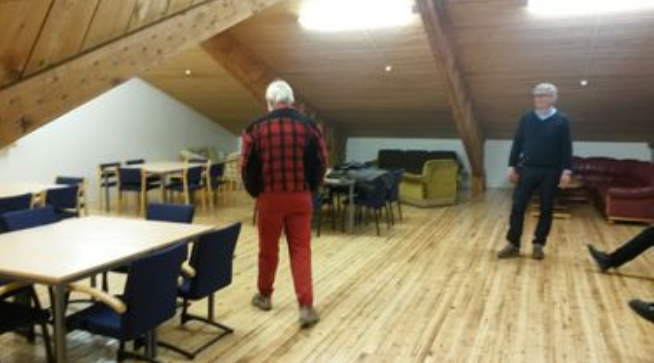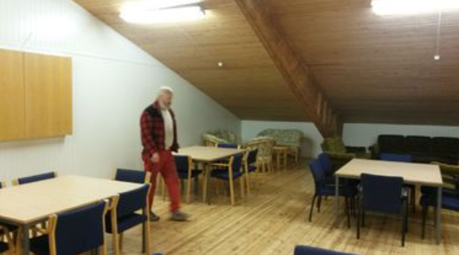 Møtesalen i annen etasje på Hall 3 er på det nærmeste ferdig. Persson kidnappet et par øst-europeere og isolerte taket, la nye plater utvendig og satte inn nye vinduer sist høst. I ettertid har bl.a. Arnt Ivar og Jan Roger slipt gulv og lakkert det. Det er montert varmepumpe og nye lamper. Videre har vi fått møblement fra mange prestegjeld, så nå er det sitteplass til ca 60 personer. Prekestol til fomannen har vi også på plass. Prosjektet er et samarbeid med NAF - de har betalt og vi har jobba.