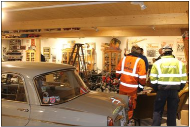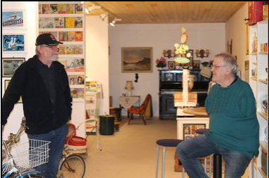 Inne i museet gikk praten som vanlig, her representert med herrene Skau og Finnerud, mens Kjell og hans medsammensvorne jobbet med utstillingene.