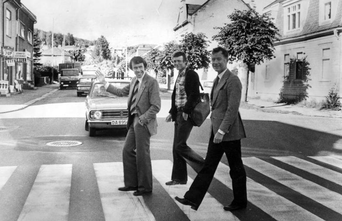 En D-Serie og en Cortina i Konnerudgata. En firkanta Fiat har sprengt idyllen ved å true seg inn mellom de to kvalitetskjøretøyene. Og jammen er det ikke vårt medlem, tidligere ordfører Erik Dalheim som med fare for liv og helse valser rett ut i trafikken. Rene stuntmannen den godeste Dalheim her.
