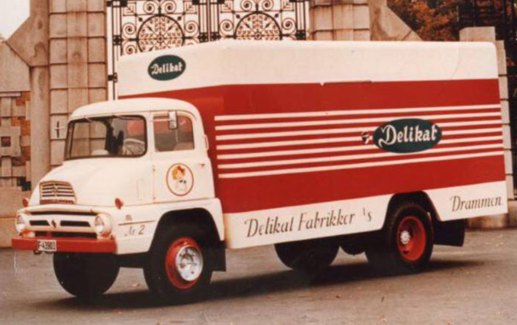 Salater av ymse typer har i mange år blitt laget i Drammen. Alt som ble hakket opp, blanda med majones og puttet i boks kunne ikke spises i Drammen, og da måtte man selvsagt ha motorisert materiell. Denne vakre doningen av type Ford Thames Trader fra 1962 ble brukt til transport til det svenske markedet. Undermotorisert og tung brukte vogn og sjåfør halve formiddagen på å komme seg opp gamle Lierbakkene. Pen er bilen definitivt. Og som så mange nybygg fra utallige karosserifabrikker er også denne fotografert foran porten i Frognerparken.