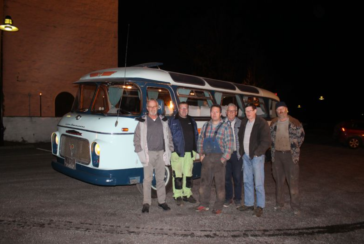 Som alltid etter avsluttede jobber har vi besøkt Bakke kjerke. Så også denne gangen, men siden vi ikke så noe til formannen i den lokale Jesus-klubben valgte vi å se oss om etter andre muligheter. Derfor avla vi Haug kjerke et besøk også. Bakgrunnen for våre dragninger mot det åndelige var for kanskje å få begunstiget bussen vår med en ørliten velsignelse. Nå er det altså i orden igjen etter en ganske stor bremse- og akseljobb. Så når rådyra igjen raner borgerskapets hager for tulipanskudd, da drar vi på skrotsafari med dette nydelige kjøretøyet. Kjøretøyet som har fått karaokeanlegg og varmeapparat i tillegg til nye frontruter. Nedenfor er avbildet noen arbeidere, et persongalleri Kjell Aukrust hadde elsket.