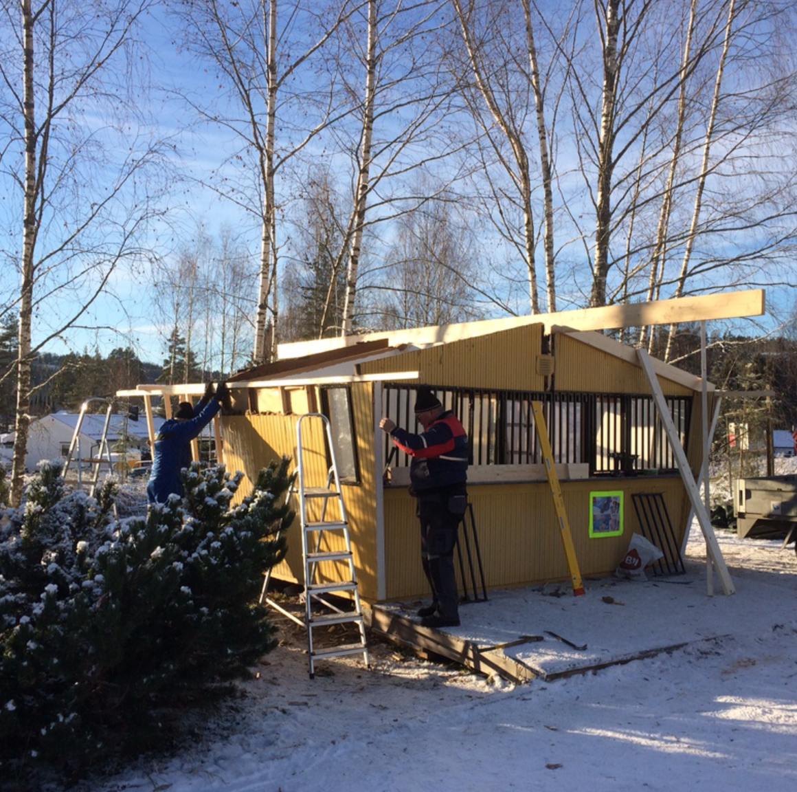 Er vel ikke akkurat sesong for spiring og grøde, men så er da heller ikke Norsk Motorhistorisk Senter noen vanlig plass. Pølsebua gror i ene enden. Det vil altså si at vi bygger på. Det er mange svære magar som skal serveres og det har vært litt plundrete til sine tider. Vår eminente altmuligmann Odd Arne "Mjongle" Syvertsen har påtatt seg også denne jobben. Og når vi først bygger på så bytter vi også taket på den gamle delen. Littegrann røtint for å si det mildt. Så den fine helgen 21. og 22. november var herrene Syvertsen, Persson, Torgersen, Finnerud, Lund og Sand Olsen igang med å rive og legge nytt tak.