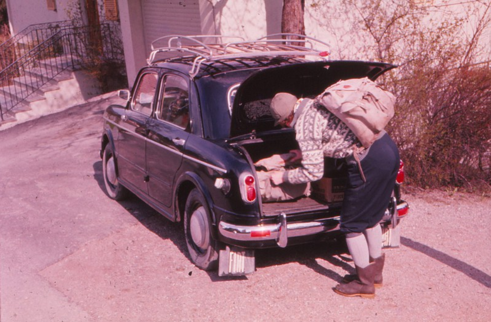 Også turantrekket til damen. Gummistøvler, lange strømper, knickers, hjemmestrikket kofte og rypesekk. Sikkert brødskiver med hardkokt egg oppi. Og kaffe. Stilig og etter datidens krav meget funksjonelt. Bilen er - var - en 1954 Fiat 1100