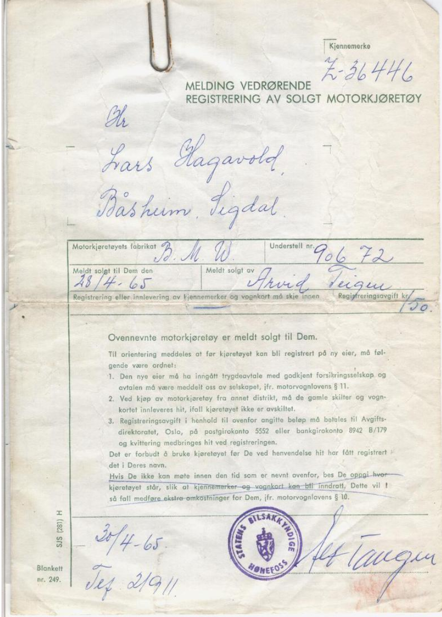 Sånne fikk vi fra Statens Bilsakkyndige før i tiden. Håndskrevet er denne, og stilet til Hr Lars Hagavold. Ikke verst at de titulerer en landsens slyngel som herre. Herren har fortsatt bilen. Den står på låven og venter på at eieren skal få ut fingen. Reg-avgifta var på snille kr 50,- Men så var timelønna kr 5,50