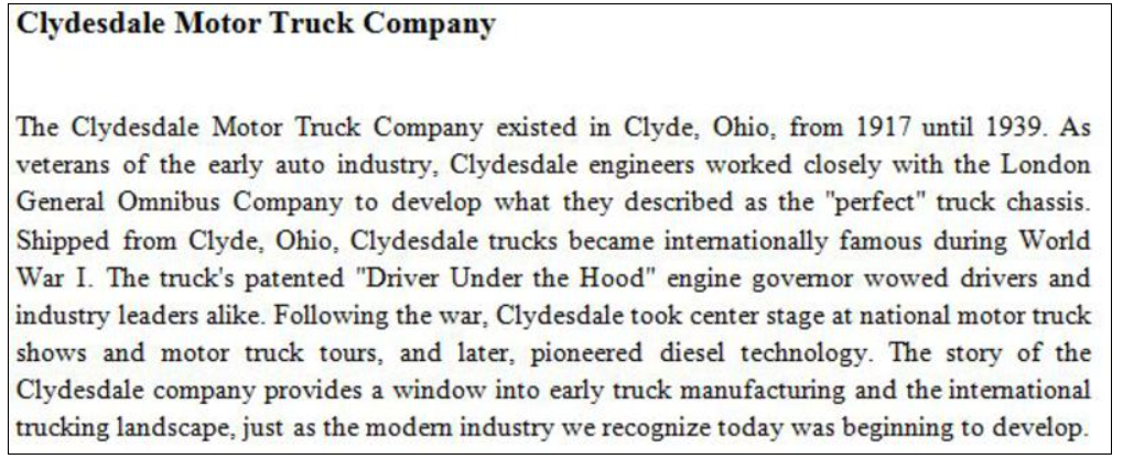 Bilen er en amerikansk Clydesdale Truck fra tidlig 20-tall, som ser ut til å være en 5-tonns utgave med betegnelsen 120B. Den er litt modifisert for norske forhold, bl.a. er den utstyrt med et lukket førerhus for å gjøre den mer komfortabel i vinterhalvåret. Videre later det til at de originale kompakte gummihjulene er erstattet med luftfylte dekk. Hvor det ble av bilen er et vanskelig spørsmål å besvare, selv tror jeg at den gikk med i storbrannen som raserte Høvik Teglverk på midten av 1950-tallet.