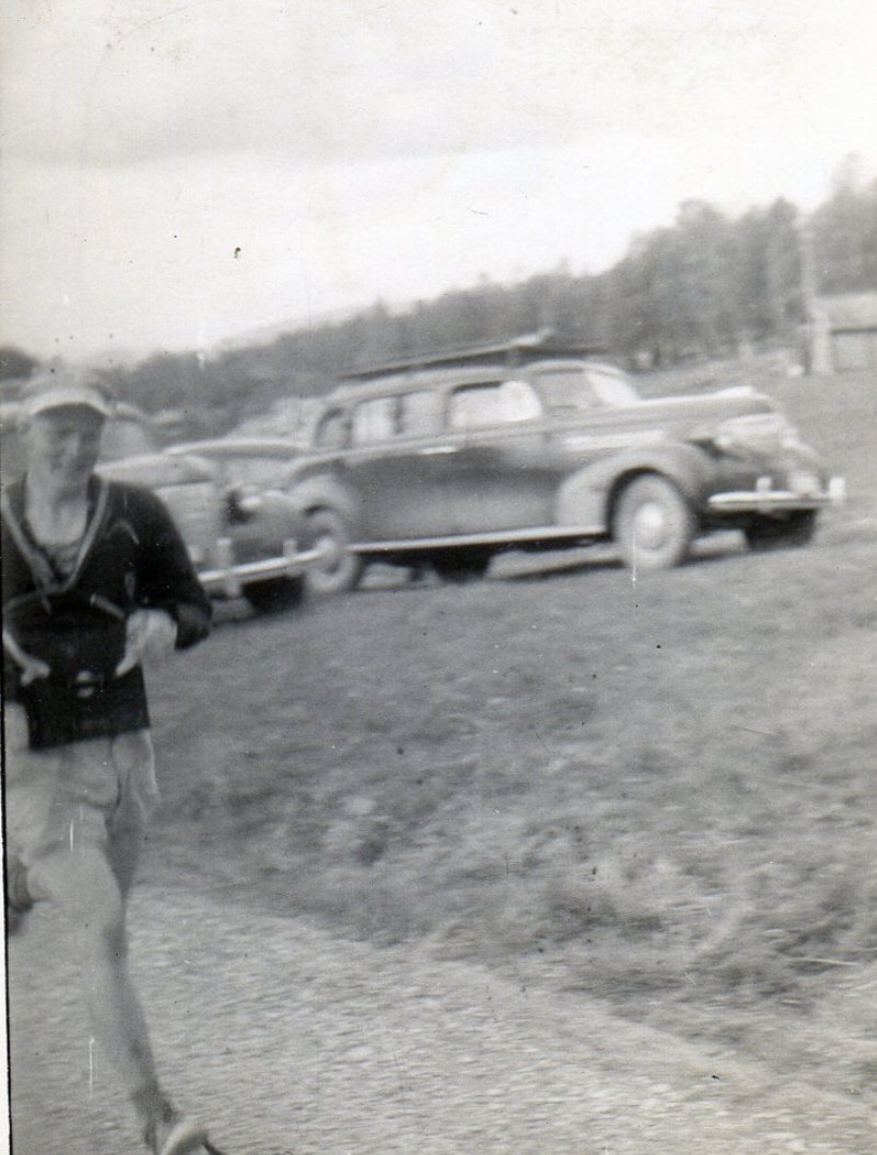 Bildet er tatt på 50-tallet. Fotografen skulle åpenbart ta bilde av en orienteringsløper. Han var neppe interessert i lange Chevrolet'er, men det er vi. Hvem kan fortelle noe om dette karrosseriet? Bilen må være fra 1939 og var vel muligens drosje. Venter spent på opplysninger.