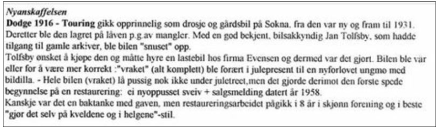Her blir det litt vidløftige spekulasjoner, men kanskje noen kan bekrefte eller avkrefte teorien som følger. Det øverste bildet av en Dodge er tatt utenfor Havnegaten 56 i Drammen for ca 90-100 år siden. Kan det være samme bil som Bjørg og Ingar Evensen brukte i mange år? 1916 Dodge. Venter spent på opplysninger fra leserne.