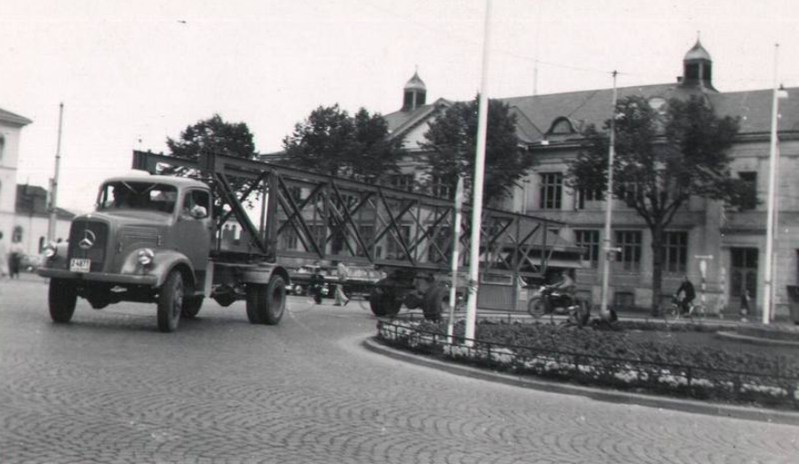 Kristensen Transport i Skoger eide denne røslige Mercedes'en på vei rundt rundkjøringen på Strømsø Torg