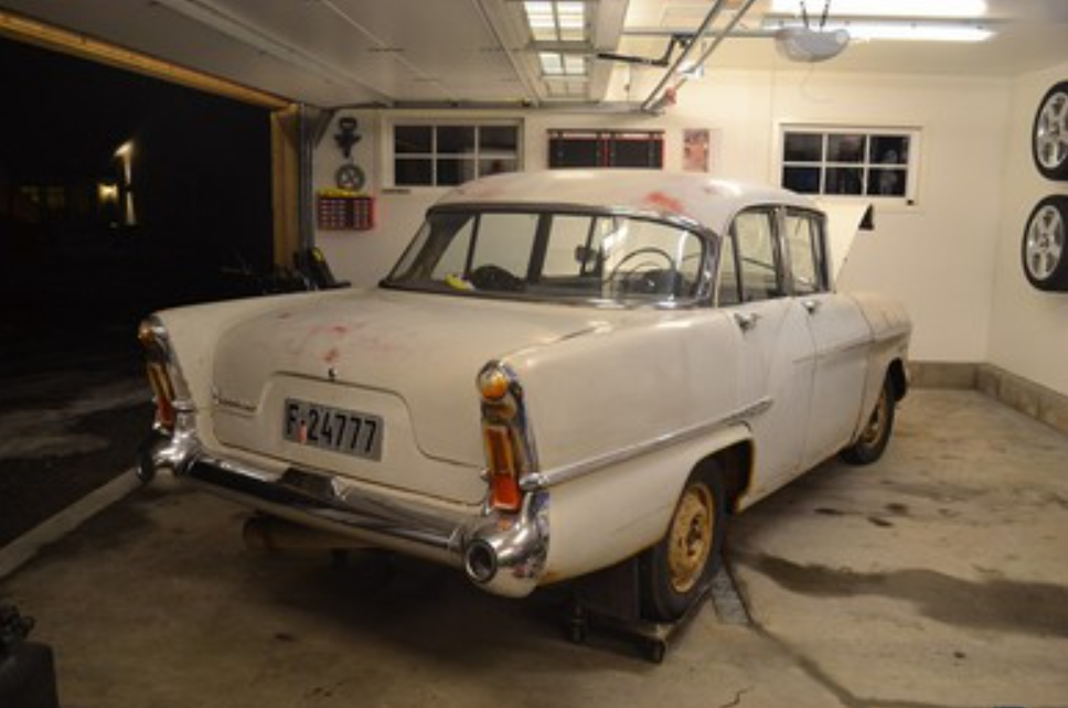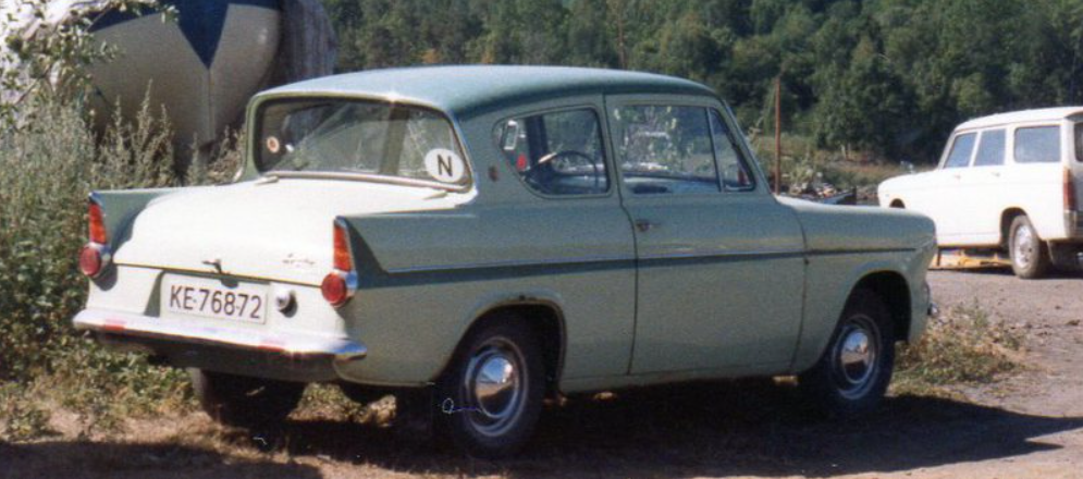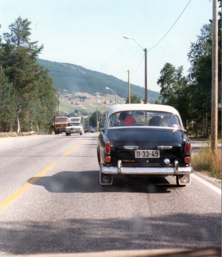 Et bilde kan fortelle mer enn tusen ord heter det. Og det er ofte definitivt riktig. Et ganske dårlig bilde kanskje på 60-tallet, men et fantastisk bilde idag. Se på takgrinda som var helt vanlig utstyr. Legg også merke til at bileieren har spandert på seg et speil utvendig på venstre side. Var intet krav om det. Skvettlapper derimot, det var det krav om. Skulle du være uheldig og miste en skvettlapp og dobbeltuheldig at lensmannen oppdaget det, var sannsynligheten stor for at du måtte en tur til Statens Bilsakkyndige for å vise bilen. Ble gjerne full kontroll ut av det. Nå er det nok mange som ikke vet hva en skvettlapp er. Det er lovlig å kjøre uten baklys i tusmørket også nå.