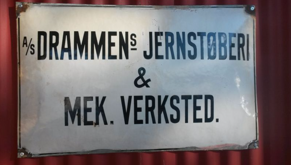 Vi har vært heldige og fått tak i et gammelt emaljeskilt. Som bildet viser et originalt skilt fra Drammens Jern. Bedriften som ble kalt verdens største bygdesmie har sikkert laget dette skiltet selv. Nå dukket det opp på Notodden og vi greide å huke tak i det. Perfekt for å fortelle hvor veghøvelen vår kommer fra