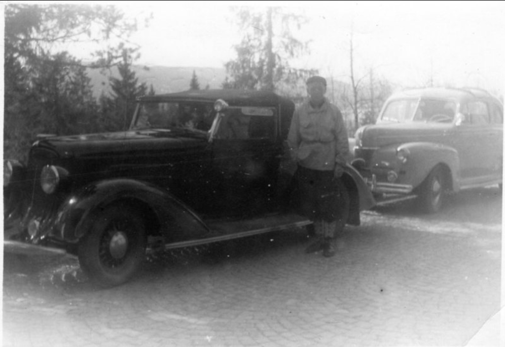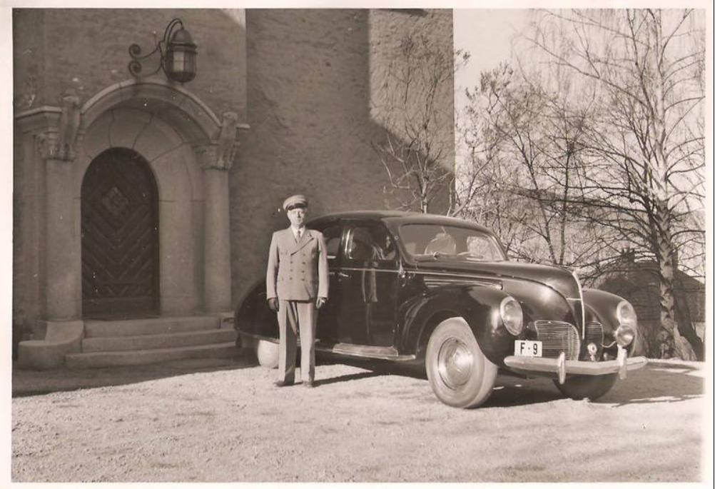 Bilde av Lincoln Zephyr 1939 utenfor Borgen med Olaf Sandengen. Denne bilen ble jeg kjørt i hjem fra fødehjemmet i 1947.