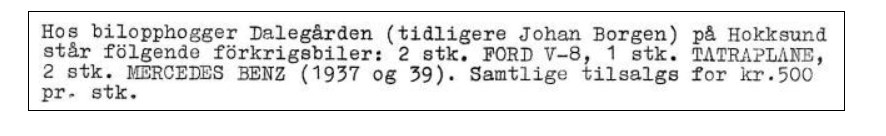 Like før jul ble det etterlyst en Tatra i Drammens Tidende. http://www.dt.no/nyheter/har-du-sett-denne-bilen-1.8676282 En bil som etter sigende skulle ha befunnet seg i Mjøndalen. Litt lenger opp i dalen befant seg et hoggeri startet av en verdensberømt Cadillac-eier. På samme sted som den like verdensberømte "Juger'n" holder til idag. Se hva Øivind Langeland skriver i Gammelbilposten nr 5 - 1974: