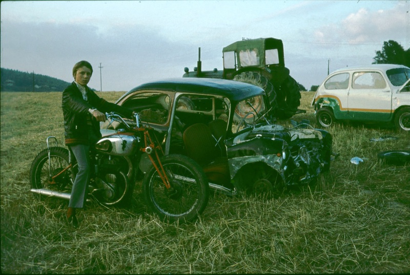 En gang for ikke så veldig lenge siden var det lov å ha det moro. Tenk at man kunne more seg med å kjøre bil og motorsykkel på jordet uten at hele messing-gjengen, barnevernet og forurensningstilsynet kom styrtende sammen med selvhøytidelige journalister. Nei, alt går definitivt ikke framover her i verden. På bildet under ser vi en bondegutt fra Skauer. Av den aller roligste sorten var nok ikke Arve Knutsen. Her rir han på en 500 BSA som sikkert fikk kjørt seg over pløgsla. Fått kjørt seg har den Fiat 600'n i bakgrunnen også. Fått oppstoppernese ser det ut som. Neppe den artigste bilen å kræsje med.