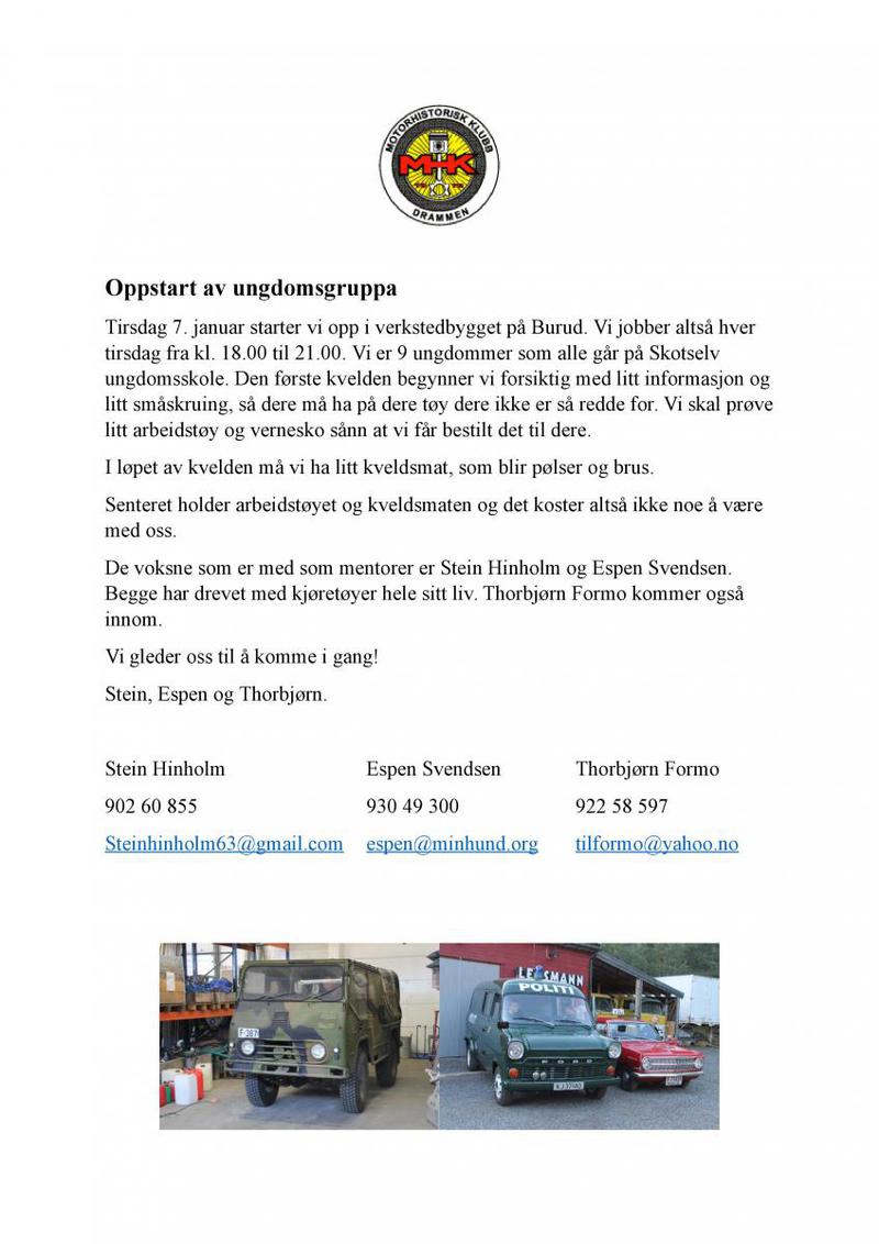 Ungdomsgruppa har ligget nede siste halvår, men nå har noen aldrende julenisser i styre og stell skremt fram et par skrotnisser som altså skal ha som oppgave å vekke interessen for motorhistorie hos en gjeng med smånisser. Hva disse folkene skal drive med er det sikkert noen som lurer på. De skal bytte motor i Aass Bryggeri sin Ford AA, de skal fikse på litt spesialavfallsproduktet Volvo Felt og sikkert en hel masse annet som red. ikke har oversikt over. Men det skal leserne holdes underrettet om både her på nettsiden og på Facebook-sidene til klubben og Ungdomsgruppa. Velkomne skal de være både yngre og litt eldre.