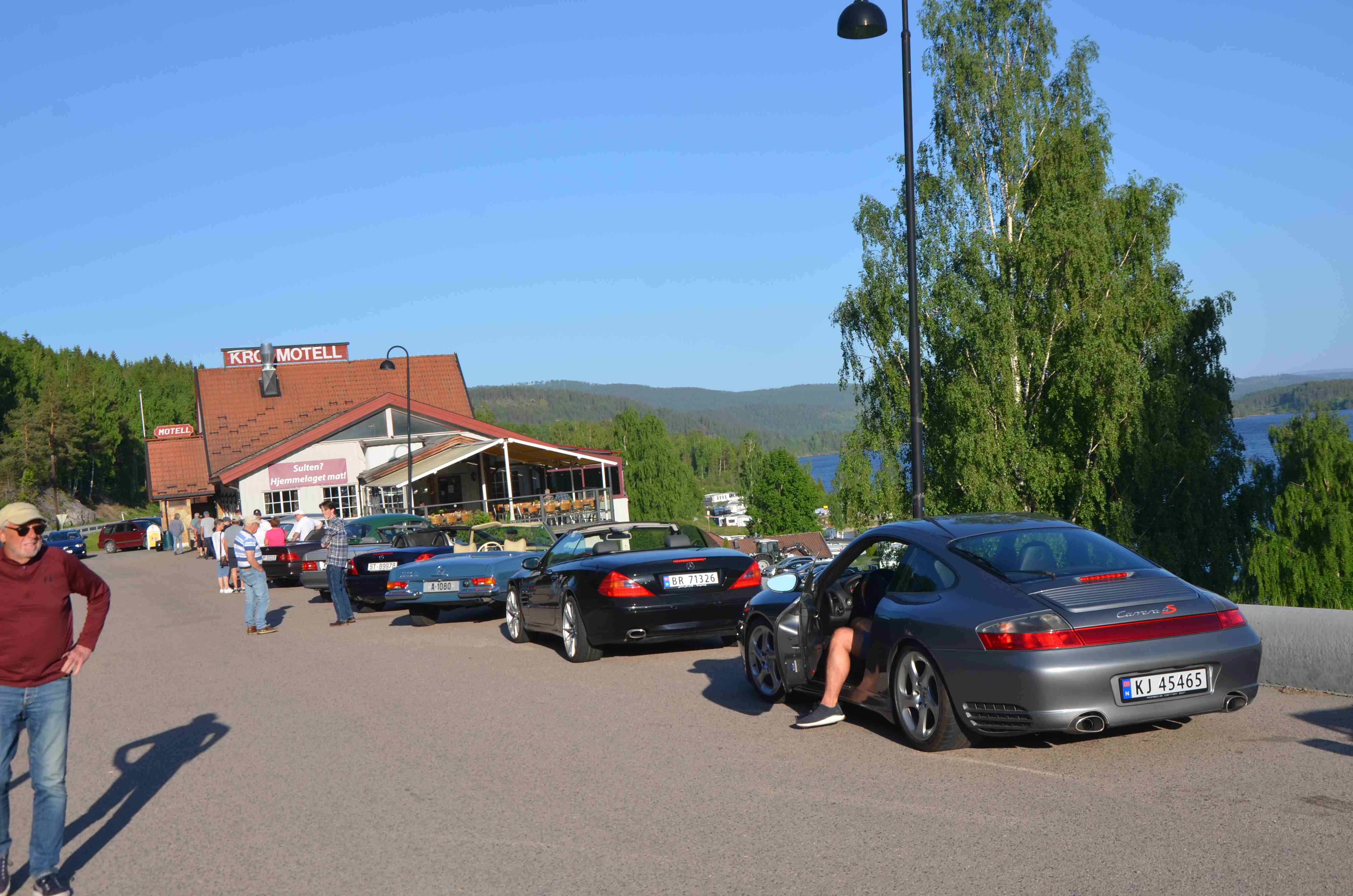 Totat 20 biler fulgte som perler på en snor i det flotte landskapet rundt Krøderfjorden, og jeg tror alle koste seg i solskinnet. På veien fra Noresund og hjemover mot Modum og Eikerbygdene gjorde vi en stopp på Krøderen Kro der det ble alt fra softis til kaffe eller burger for de mest sultne.