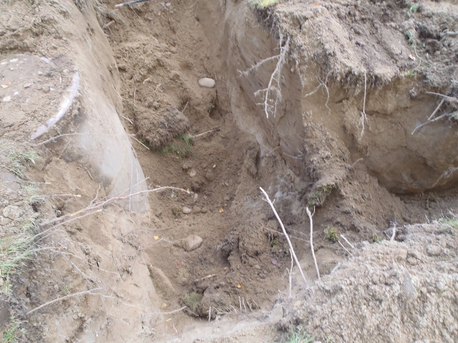 Nærbilde av hølet vårt. Fine rene masser, litt røtter her og der, og en og annen meit. Ikke noe gull, bare kabler og dritt nedi her.