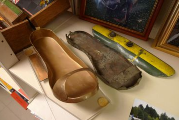 Jawa 500cc longtrack-sykkel. Hans Erik Fuglerud kjøpte sykkelen av Barry Briggs i 1974. Briggs var den mestvinnende kjører i verden innen speedway og langbanesport. Til høyre: ”Slepeskoer”, såleforsterkning venstre fot?